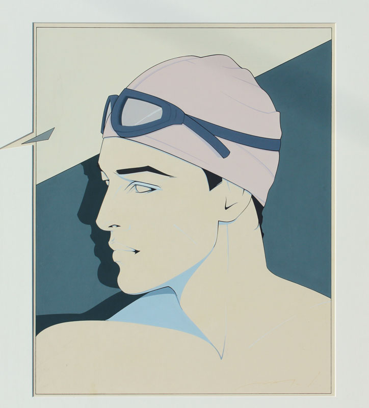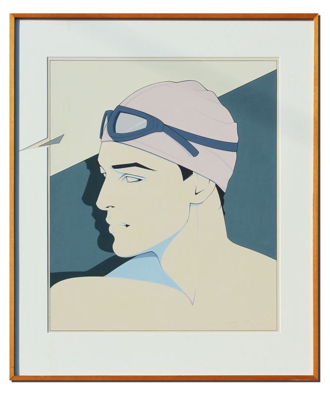 NAGEL, Patrick, (American 1945-1984): ''Swimmer'', Profile of Male with Cap and Goggles, Acrylic on Thick Cardboard, site size, 25'' x 21'', signed lower right, custom period frame, 35'' x 28'', purchased from the wife of Nagel in Atlanta. This Painting is included in the book, ''The Art of Patrick Nagel'', written by the artist.