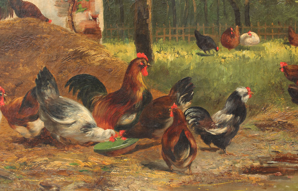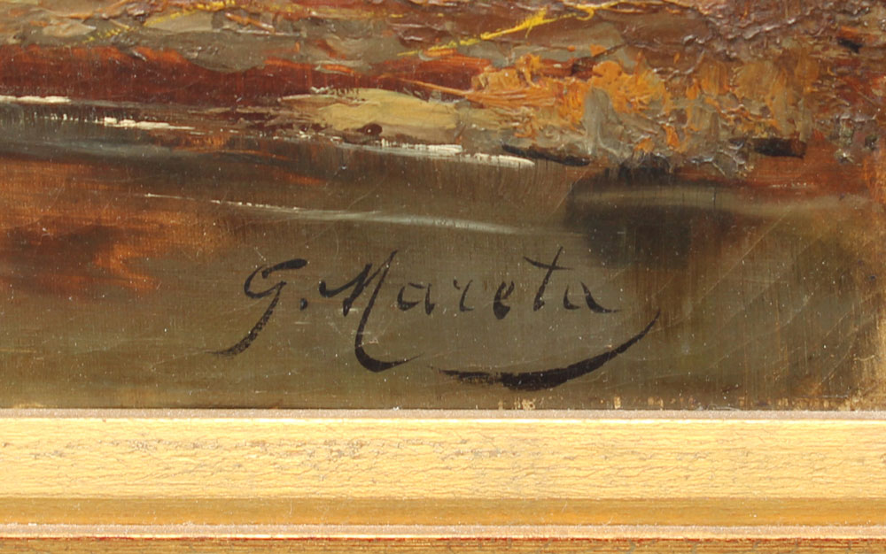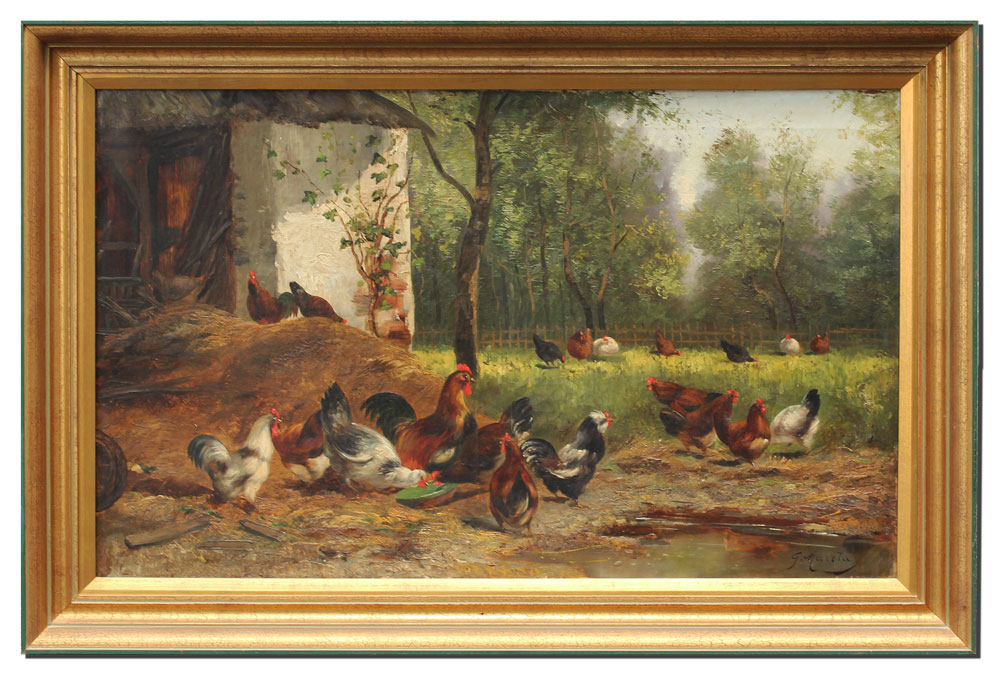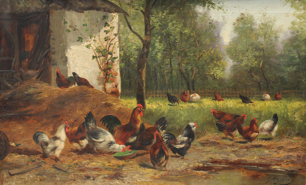 MARETA, G., (Italian): Chickens in a Sunny Barnyard Landscape, Oil/Canvas, 19 5/8'' x 32'', signed lower right, newer painted frame, 24 1/2'' x 37''.