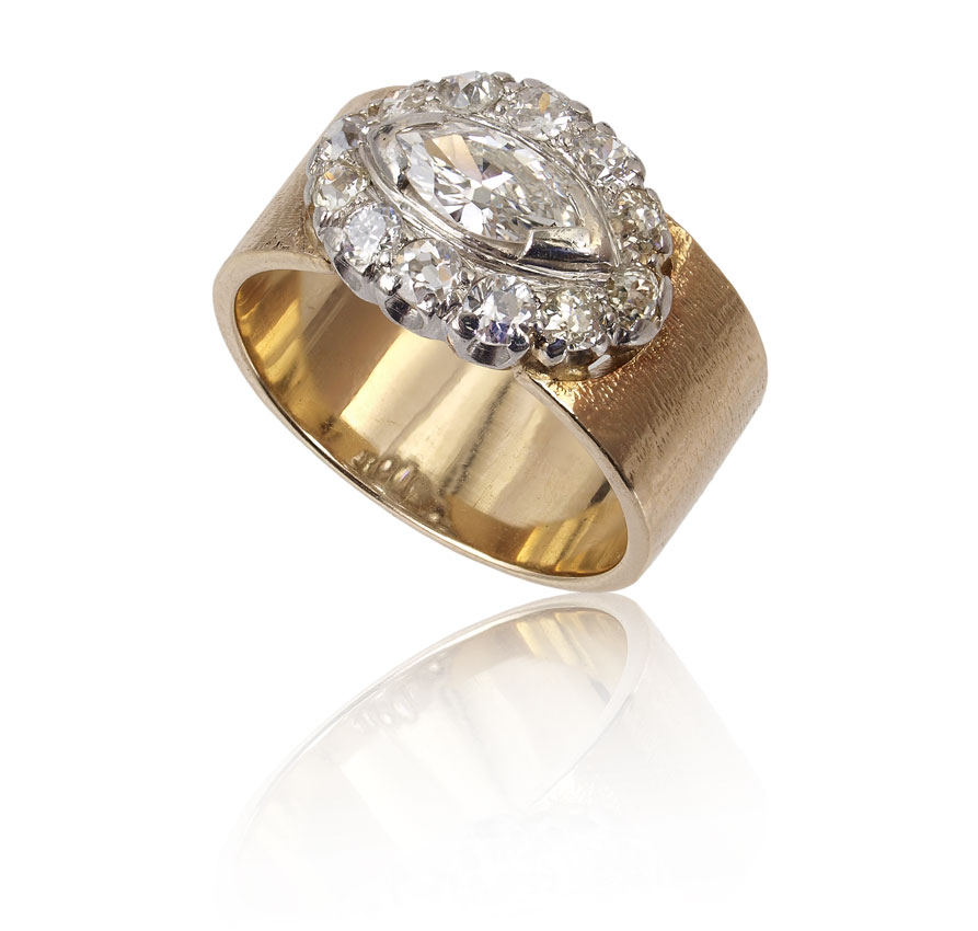A WIDE 14K GOLD 1.18 CT DIAMOND BAND RING: Centering an approx. .43 Ct marquise brilliant diamond of VS-1 clarity and H color. Framed by 12 old mine and old European cut diamonds totaling approx. .75 Ct., averaging VS-SI in clarity and H-K in color. Prong set. Size 6.5. Weight 8.8 grams. Sold with current Atlanta Gemological GIA graduates appraisal for $3,950.