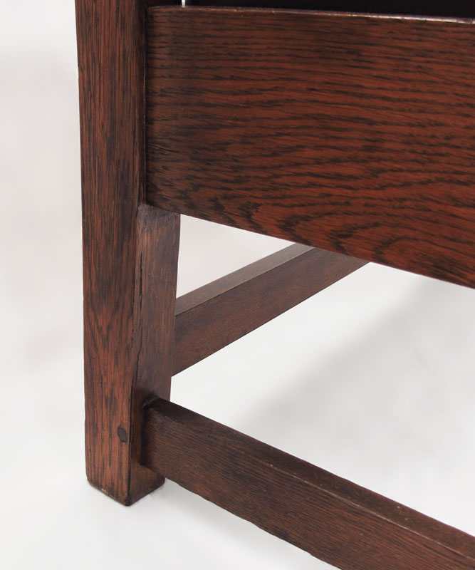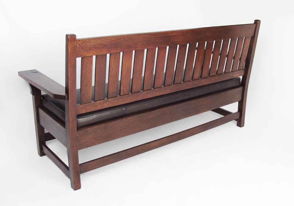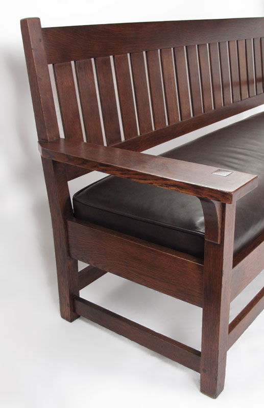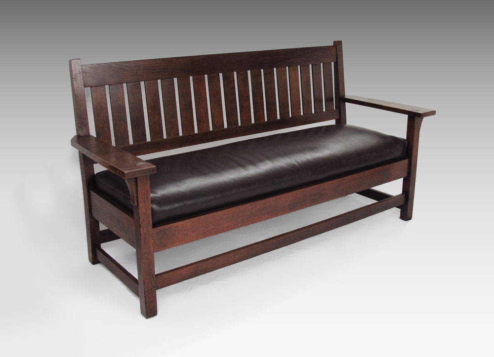 GUSTAV STICKLEY DROP ARM SETTLE #219: Drop arm thru tenon construction with corbels, 17 slat back, and leather covered cushion. Appears to be clean and refinished. Approx. 71.5'' x 37.5'' x 26''. As seen in ''Gustav Stickley after 1909'', page 15.