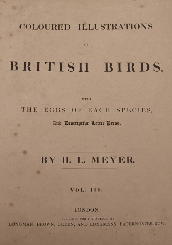 MEYER, Henry Leonard, (British, 1797-1865): Volume 3 only of his book series titled ''British Birds'' with approx. 63 of the original 78 hand painted lithograph plates remaining. This volume encompasses Water and Shore birds of England. Published 1837 by Longman, Brown, Green, and Longmans, London.