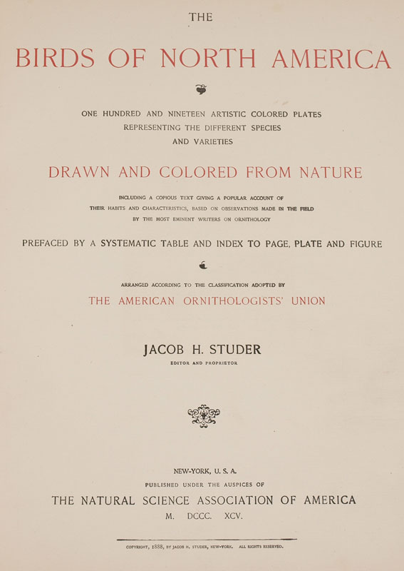 STUDER, Jacob H., (1840-1904): ''Birds of North America'', published 1895 by The Natural Science Association of America. 119 color plates, book appears to be complete. Gilt edges, embossed leather and gilt covers. 15 1/4'' x 12 3/4'' x 2''.