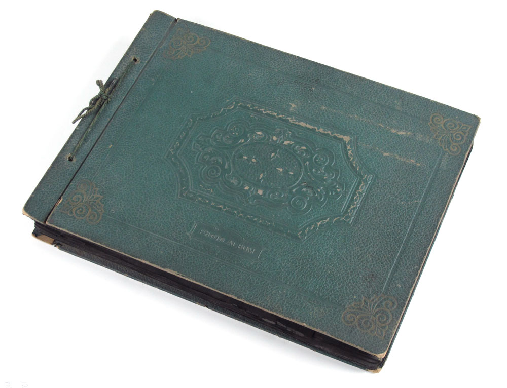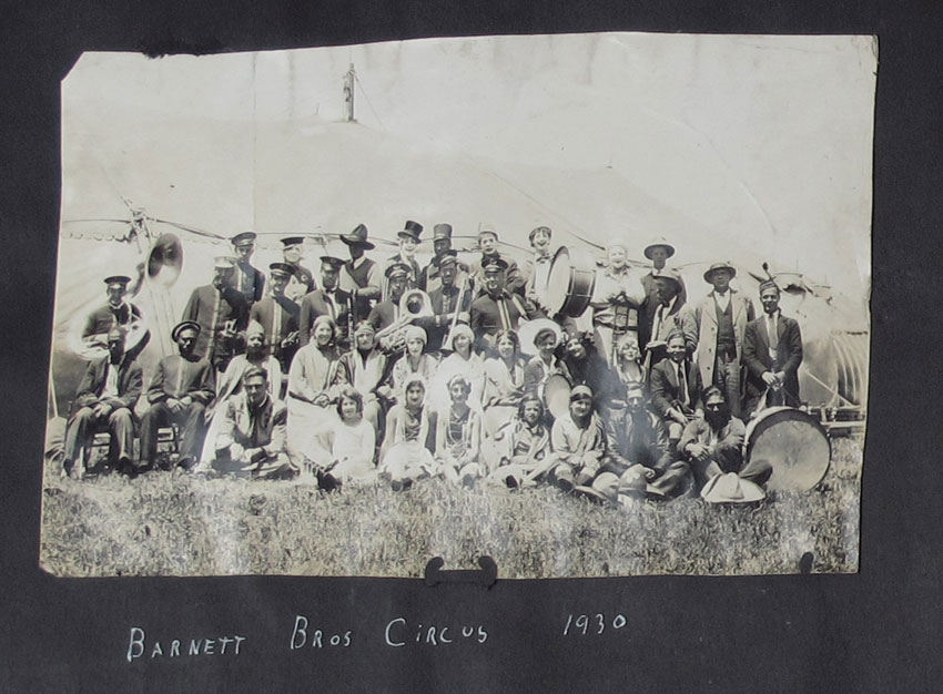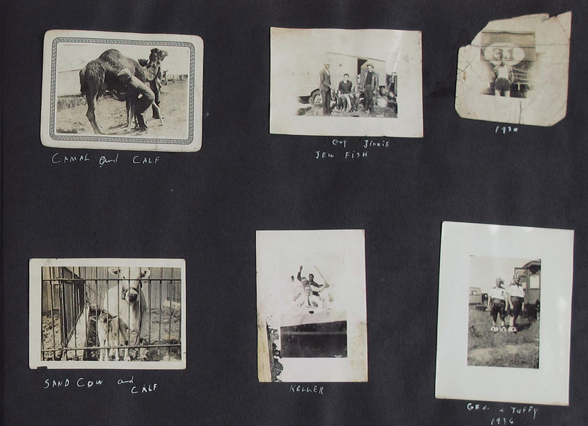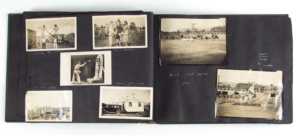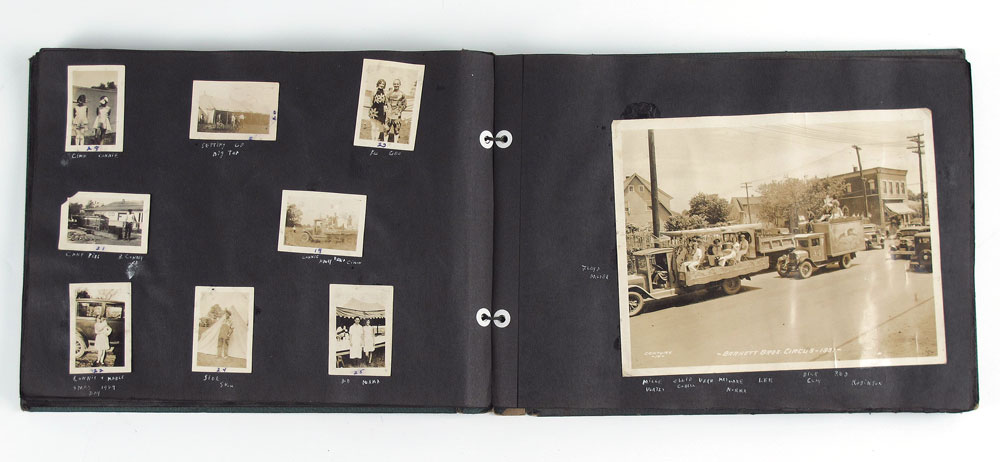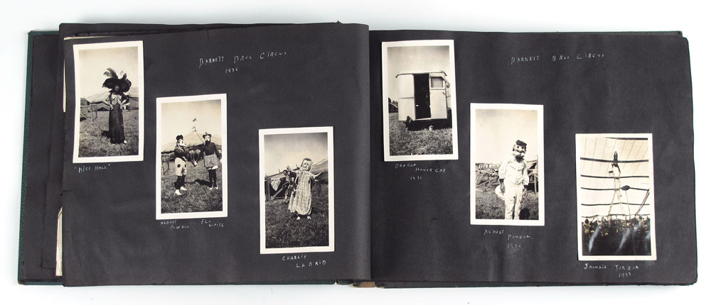 1930'S BARNETT BROTHERS CIRCUS PHOTO ALBUM: Approx. 500 vintage photos of behind the scenes life of performers in the Barnett Brothers, Wallace Bro's, and Haag Circus's. Primarily Barnett Brothers, a ''Mud Show'' circus, started in 1927 and then acquired by Wallace Brothers in the 1940's. Pictures of nearly every performer with names underneath, animals, trailers and towns. Several picture of children and child performers. Book measures 15 1/4'' x 11 1/4'' x 1 3/8''.