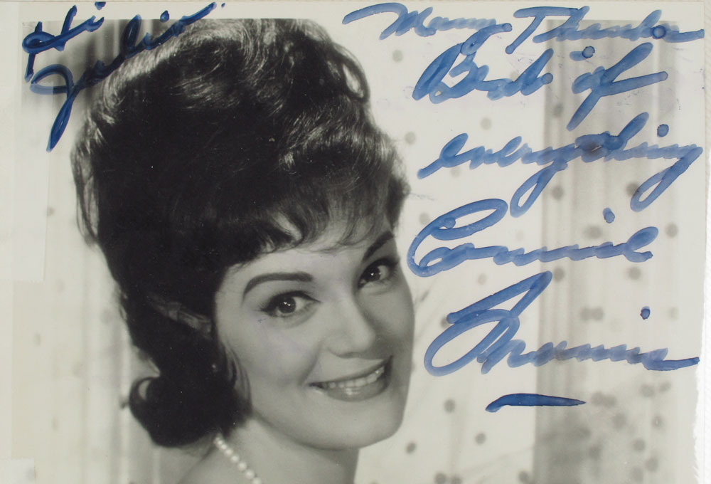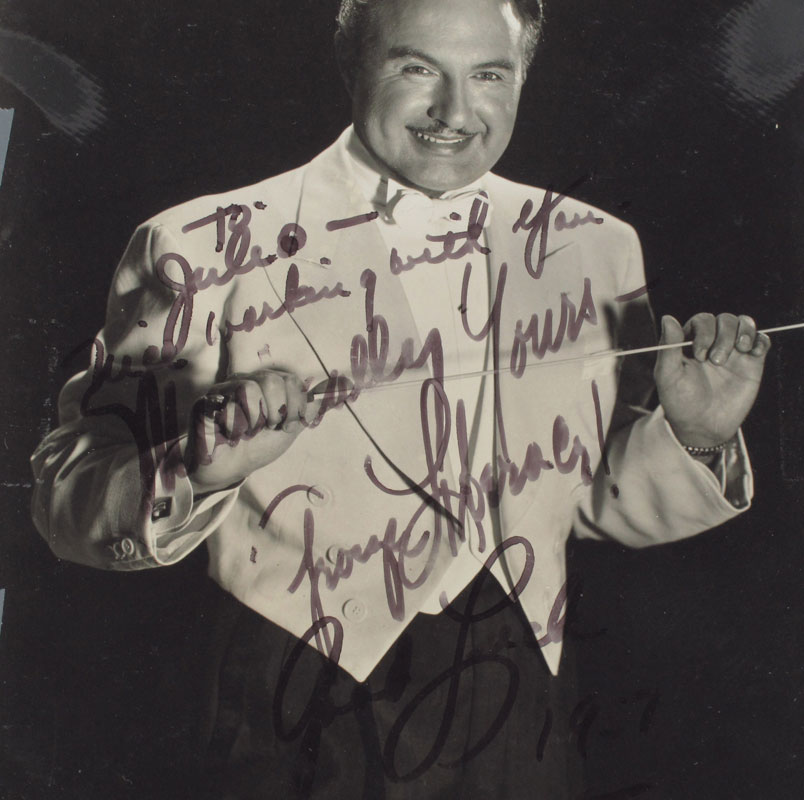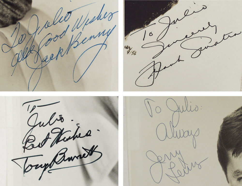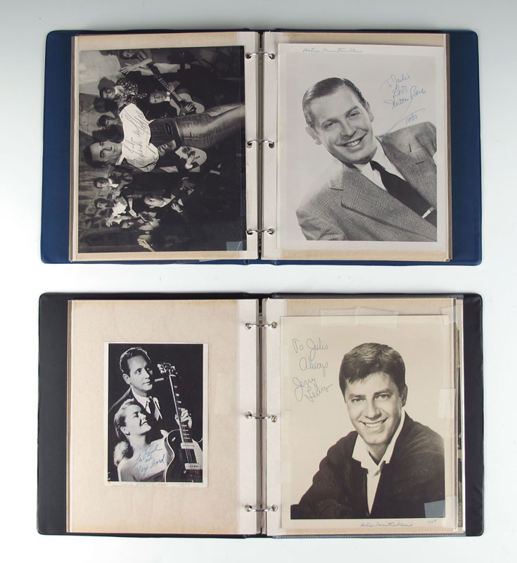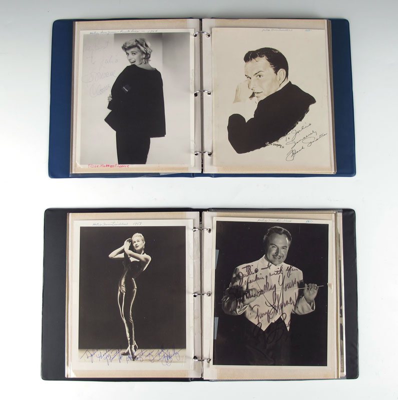 COLLECTION OF 1950'S HOLLYWOOD AUTOGRAPHS: Reputedly acquired by a bellhop at the Hotel Fountainebleau in Miami and the Hotel San Juan in Puerto Rico during the 1950's-1960's. All are signed on photographs of varying sizes, most dedicated to Julio. Highlighted autographs include Jack Benny, Patty Page, Jimmy Durante, Sarah Vaughan, Donald O'Connor, Rosemary Clooney, Frank Sinatra, Tony Bennett, 2 Connie Francis, Johnny Ray, Milton Berle, Paul Anka, Marty Allen, Nancy Ames, Mercedes Simone, Liberace (signed George Liberace), Les Paul and Mary Ford, Jerry Lewis, The Four Aces, Leslie Uggams, Jerry Vale, The Craddock Brothers, and more unidentified. Photos have been in a 3 ring binder and several have been taped in.