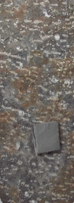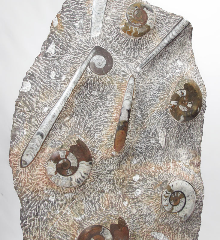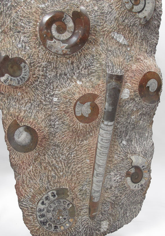 LARGE AMMONITE & ORTHOCERAS FOSSIL SLAB: Polished Ammonite & Orthoceras slab, would make a great display piece in an office or home. Measures 39 1/4'' x 17'' x 2 1/2''.