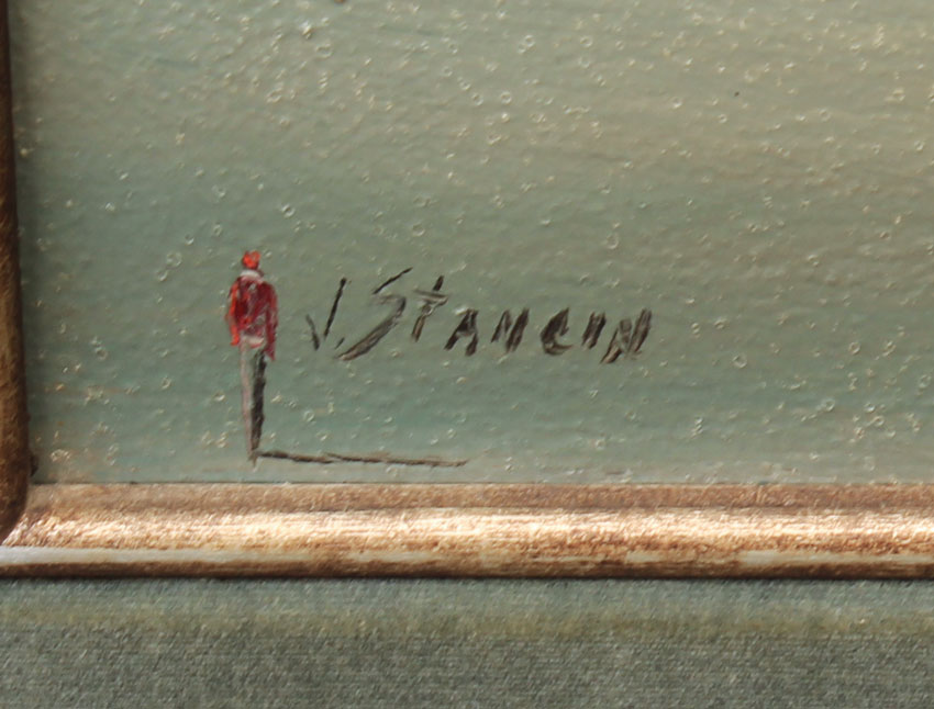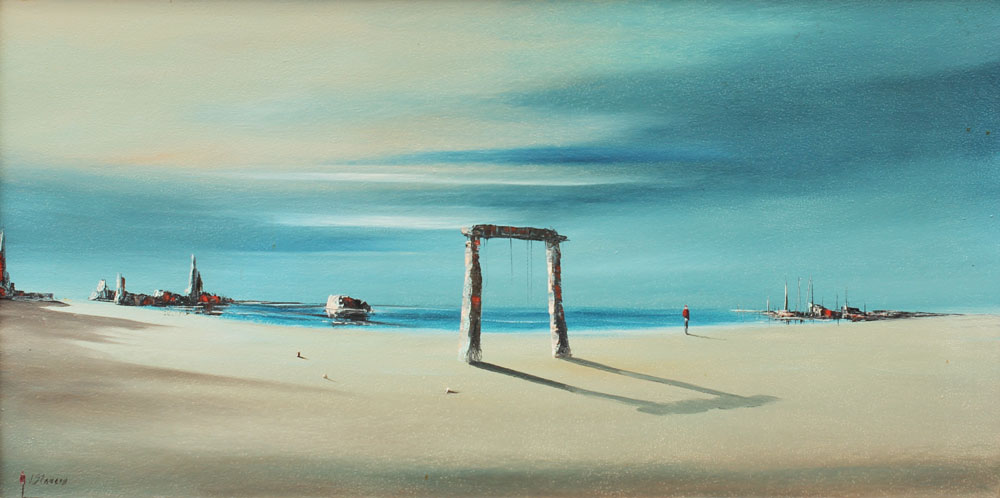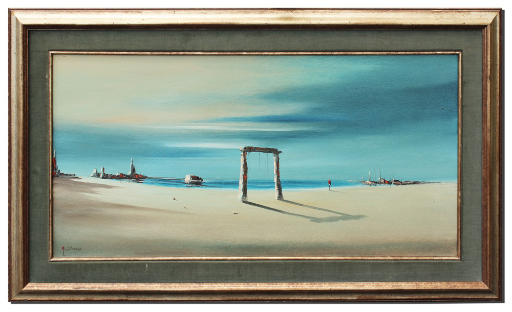 STANCIN, John J., (European, 20th Century): Surreal Shoreline with Ruin Boats and Figure, Oil/Canvas, 18'' x 36'', signed lower left, period frame, 26'' x 44''.