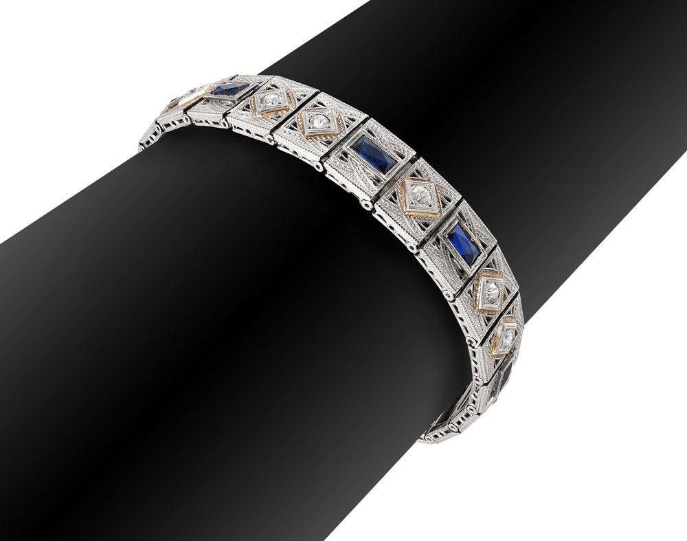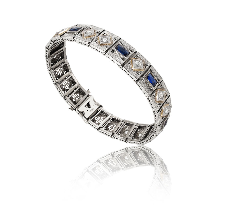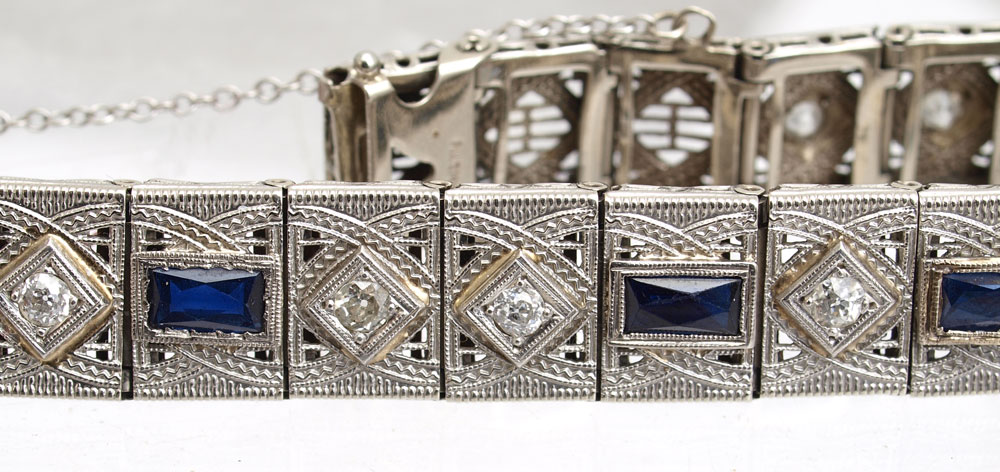 14K WHITE GOLD & PLATINUM FILIGREE BRACELET: With 11 Old mine cut diamonds totaling approx. 1 Ct., rated VS-SI in clarity and H-I in color. There are 6 bezel set rectangular shaped French cut synthetic sapphires. Length 7.5''. Weight 21.7 grams. Sold with current Atlanta Gemological's GIA graduate appraisal for $4,850.