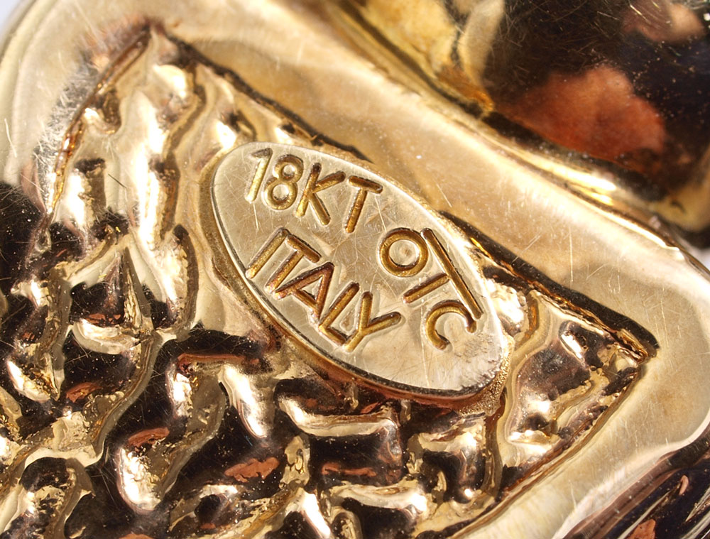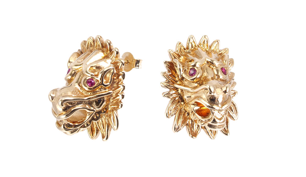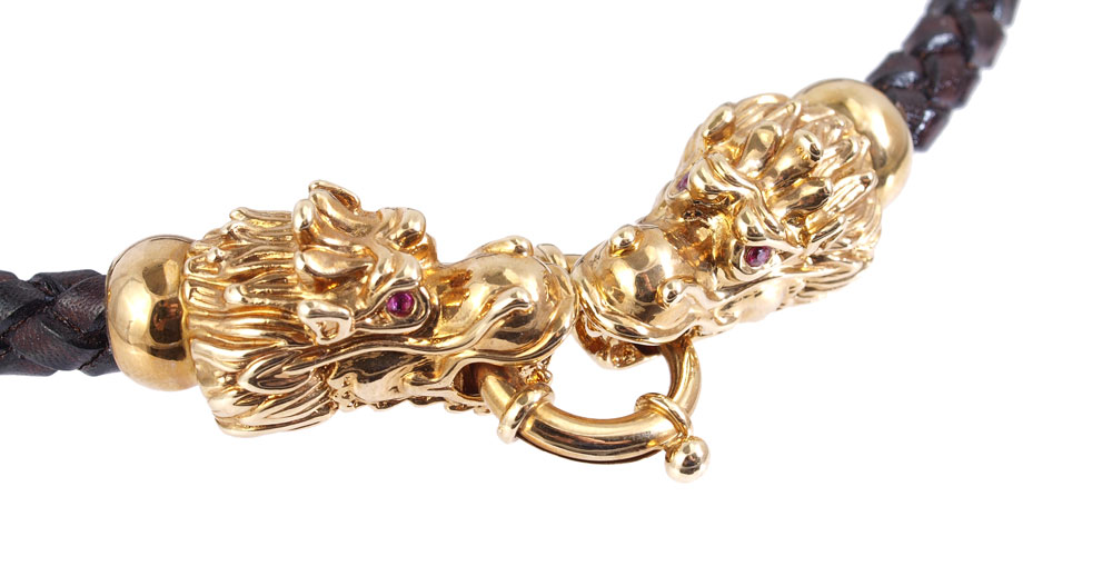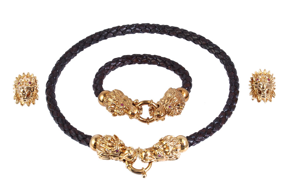 ITALIAN 18K SUITE CELEBRATING THE YEAR OF THE DRAGON: 18K yellow gold suite of necklace, bracelet and earrings. Each of the hollow dragon's heads contains round faceted rubies as eyes, 12 stones approx. 1.00 Ctw. Braided leather ropes on necklace and bracelet. Giant spring ring closures. Post and nut closures on earrings. Necklace approx. 16.5'' length. Weight: 27.0 grams approx. Signed OTC Italy 18K.