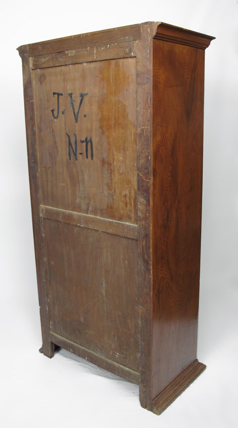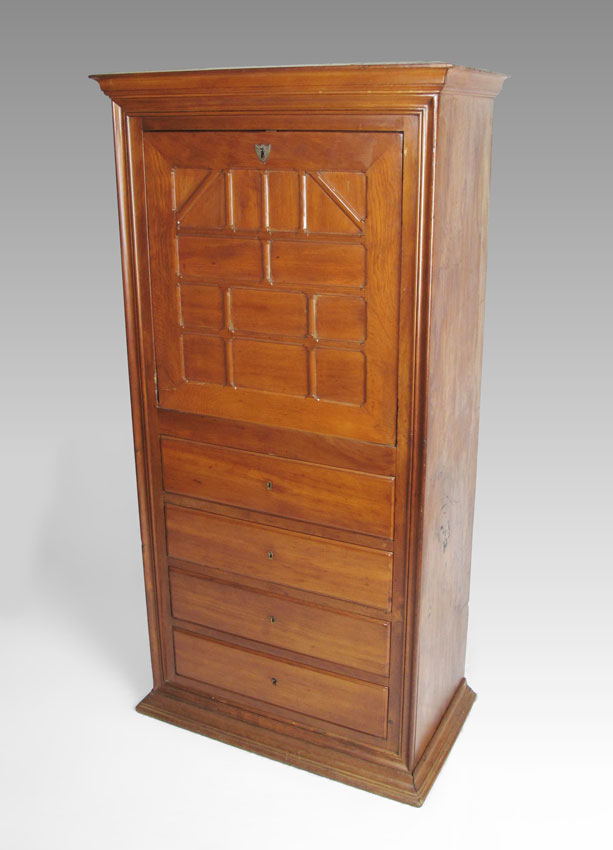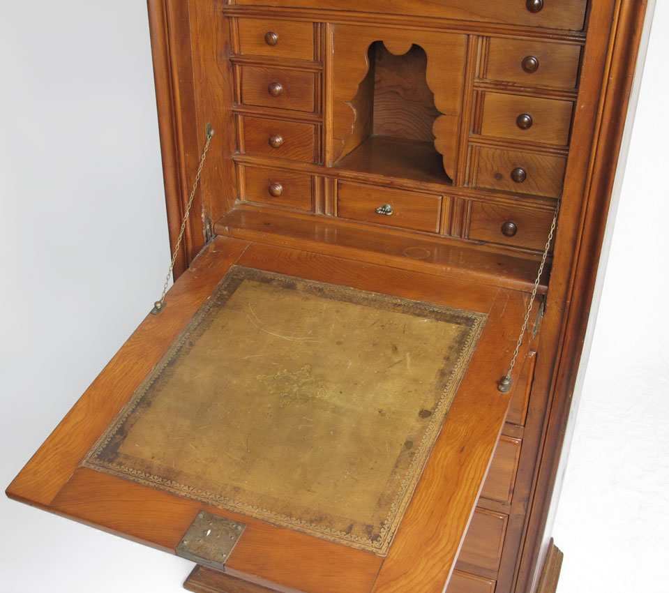 PINE SECRETAIRE ABATTANT: Front door panel with applied geometric decoration which opens to reveal 10 drawers, central cubby hole with applied decoration. Embossed leather writing surface over 4 full length drawers. 64'' h. x 31 3/4'' x 17 1/4''.