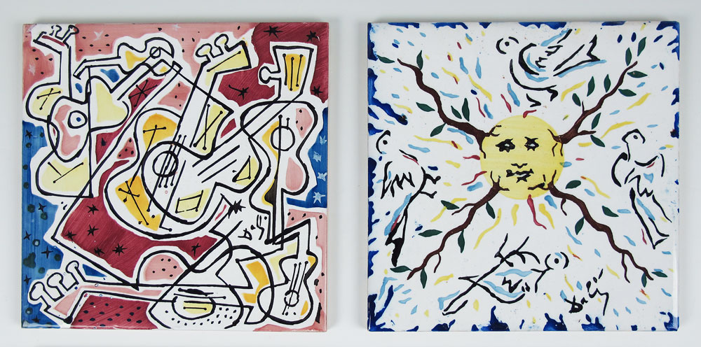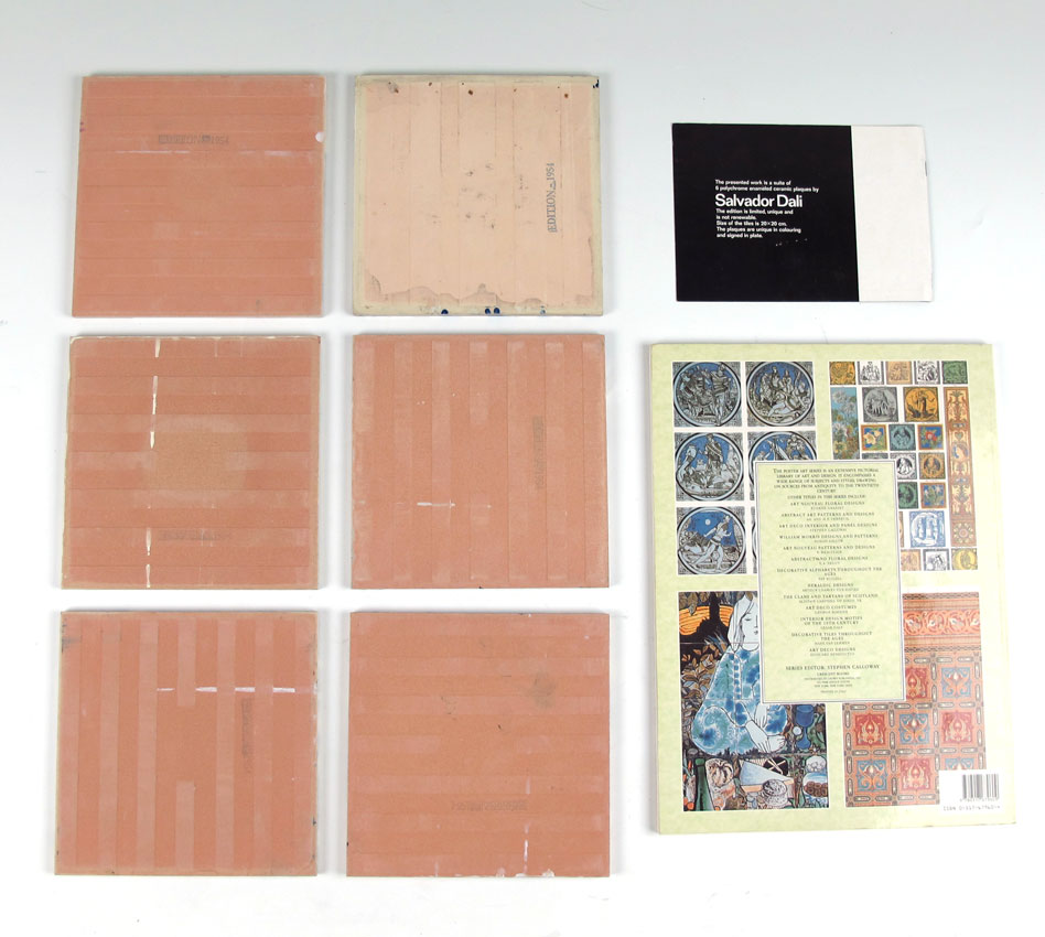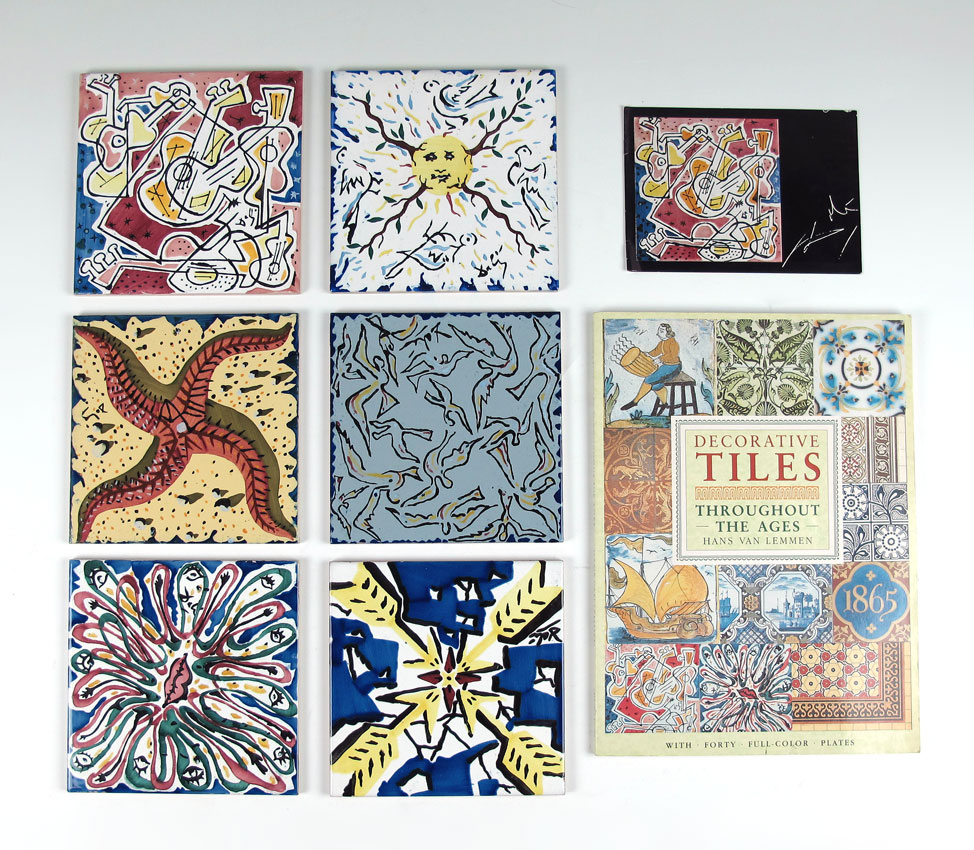 6 SALVADOR DAIL PAINTED TILES, 1954: Marked verso edition 1954, they measure 7 3/4'' x 7 3/4'', sold with the original pamphlet that came with, titles to include; ''Le Guitars'', ''Le Colombes, ''Le Flechettes'', ''Le Soleil Vegetal'', ''Le Vaiser de Feu'', and L'Etoile de Mer'', polychrome enameled ceramic plaques, unique in coloring and signed in the plate.