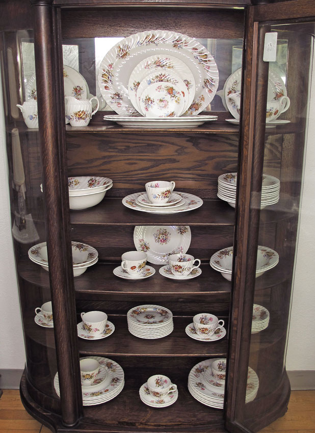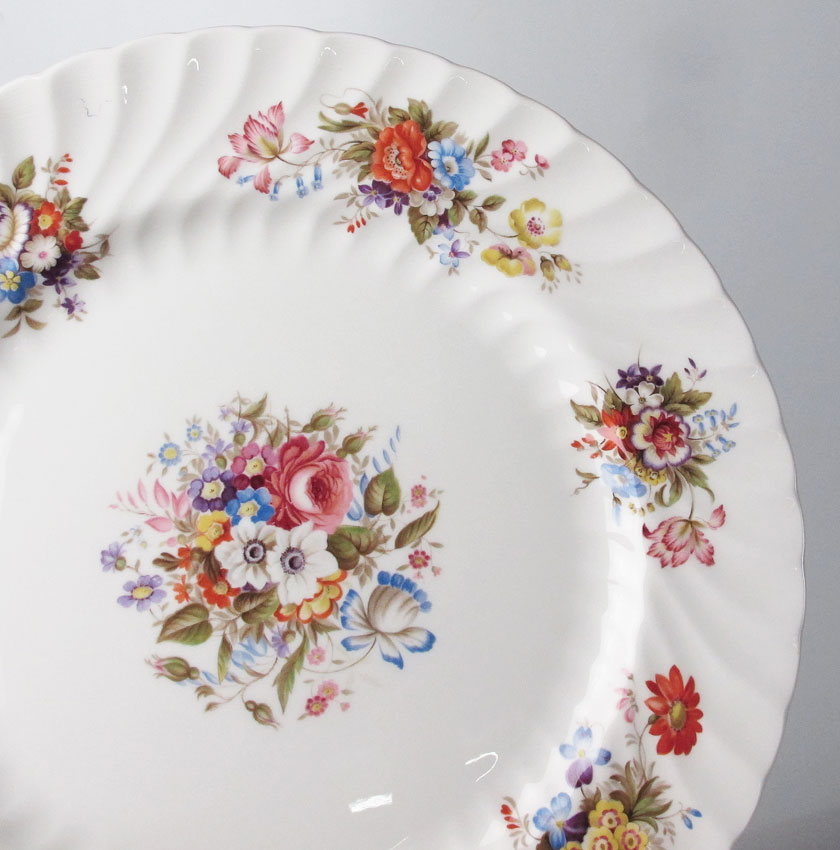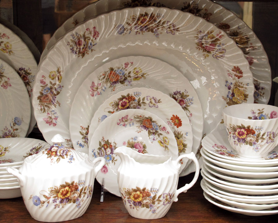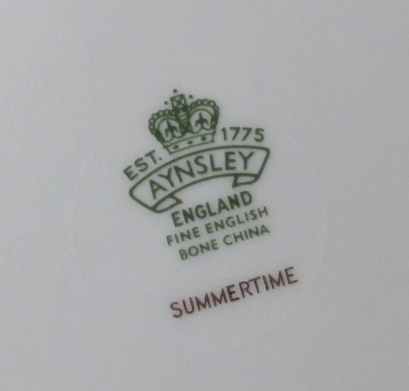 AYNSLEY ''SUMMERTIME'' FINE BONE CHINA SERVICE: Approx. 68 pieces in the Summertime pattern by Aynsley to include 12 dinner plates (10 1/4''), 3 salad plates, 12 bread and butter plates, 10 soup bowls, 9 teacups, 10 saucers, platter (15 3/4'' x 12 1/4''), 4 oval open vegetable, sauce boat and underplate, open creamer, covered sugar, small bowl, 2 round serving bowls.
