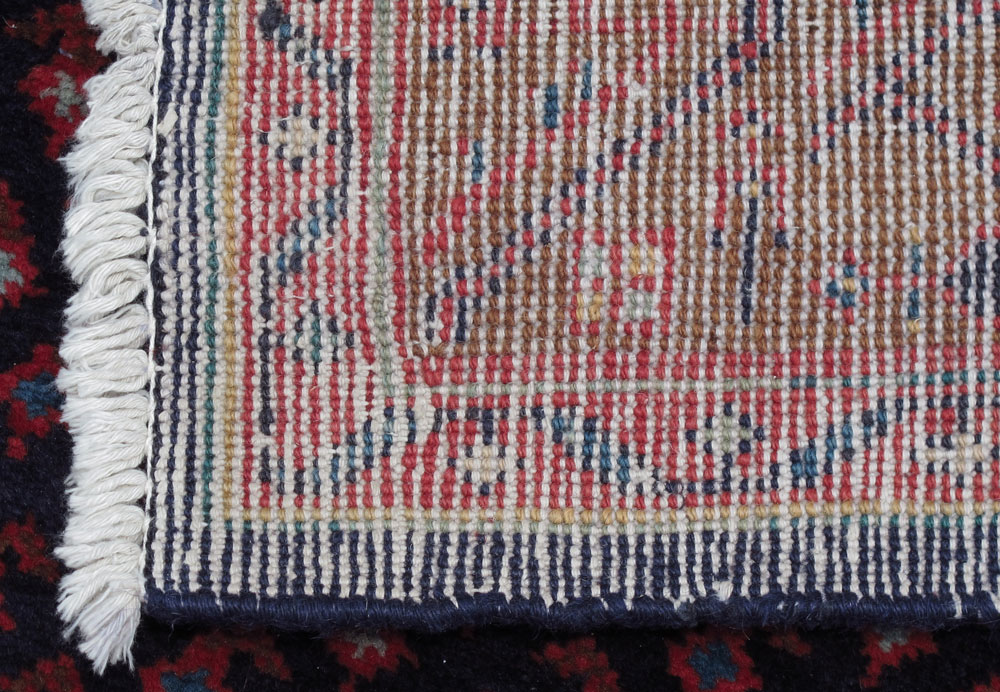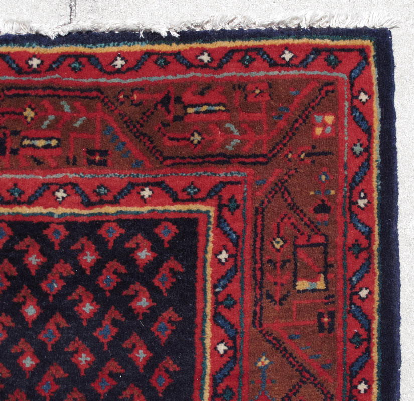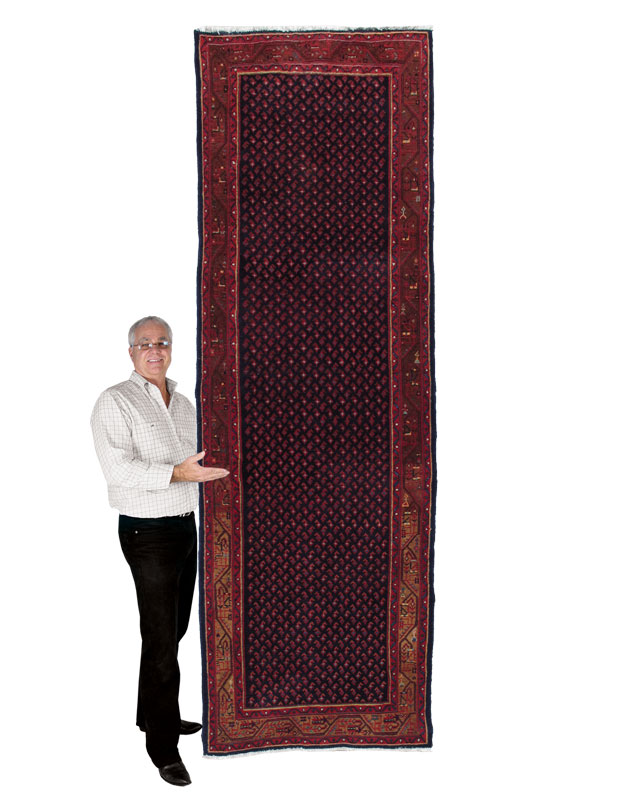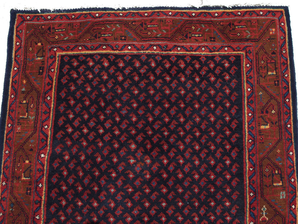 PERSIAN SERABAND HAND KNOTTED WOOL RUNNER, 3'7'' x 10'1'': This Serab has a deep blue-black field that is covered with very small botehs or paisley motifs. The traditional field design is complemented by the traditional border motifs of a sort of stepped vine and leaf in colors of red, brown, and beige. In this case the lighter border frames the darker field. A good looking runner that will also be very practical and durable. Condition is good.