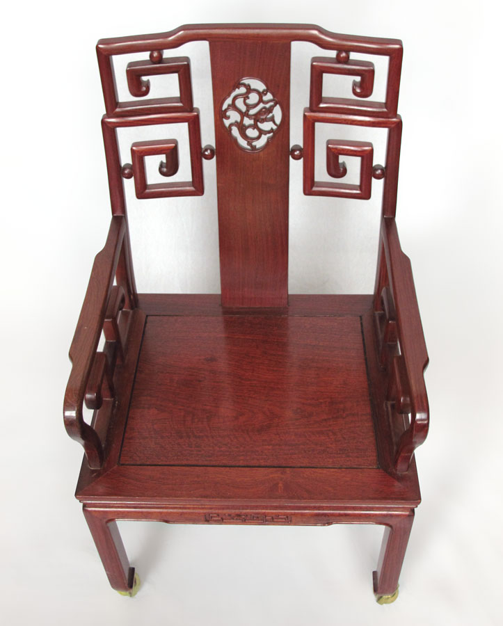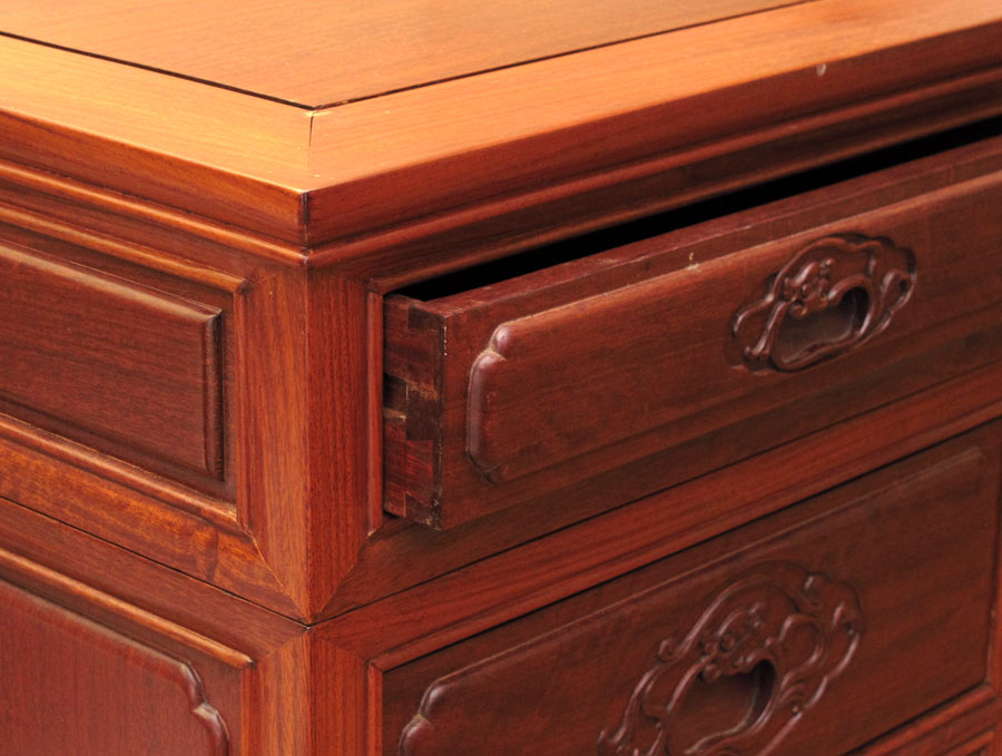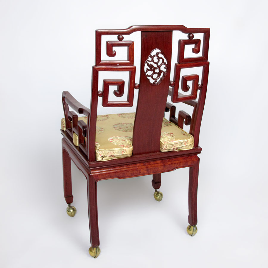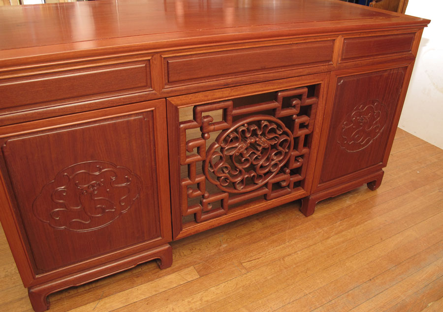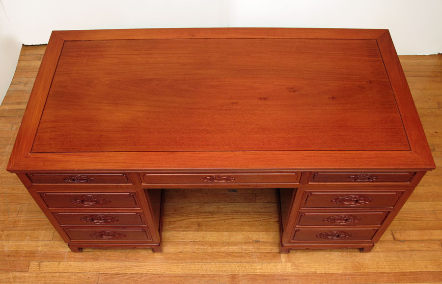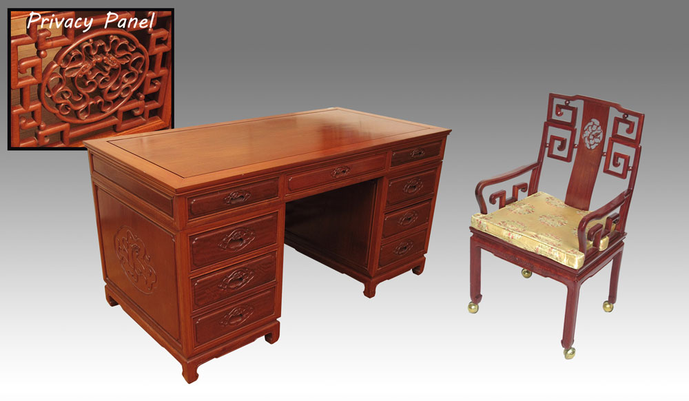 ORIENTAL DESK AND CHAIR: Desk with central top drawer, 4 drawers either side with inset carved pulls. 31'' h. x 60'' x 30''. Sold with carved desk chair on castors, oriental motif cushion. 42'' h. x 23'' x 22 1/2''.