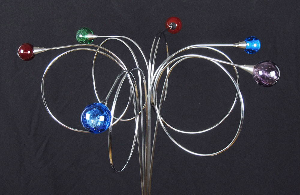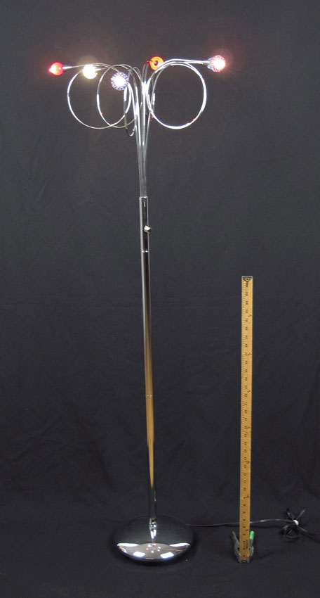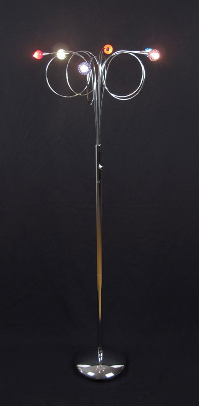 COOL CHROME AND BLOWN GLASS FLOOR LAMP: With six multicolor hand blown bubble globes, each on a thin looping chrome ''spiral-spring'' arm. Switch on pole. Approx. 5' tall.