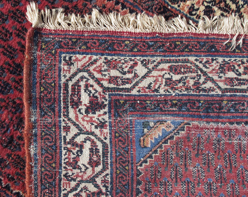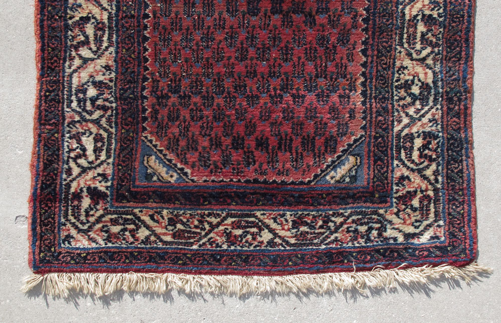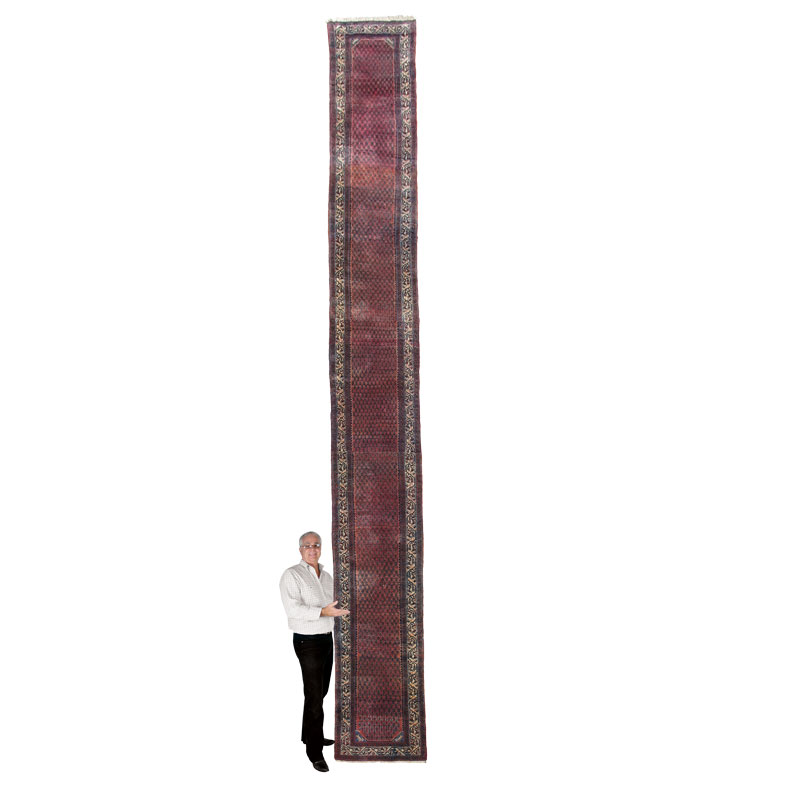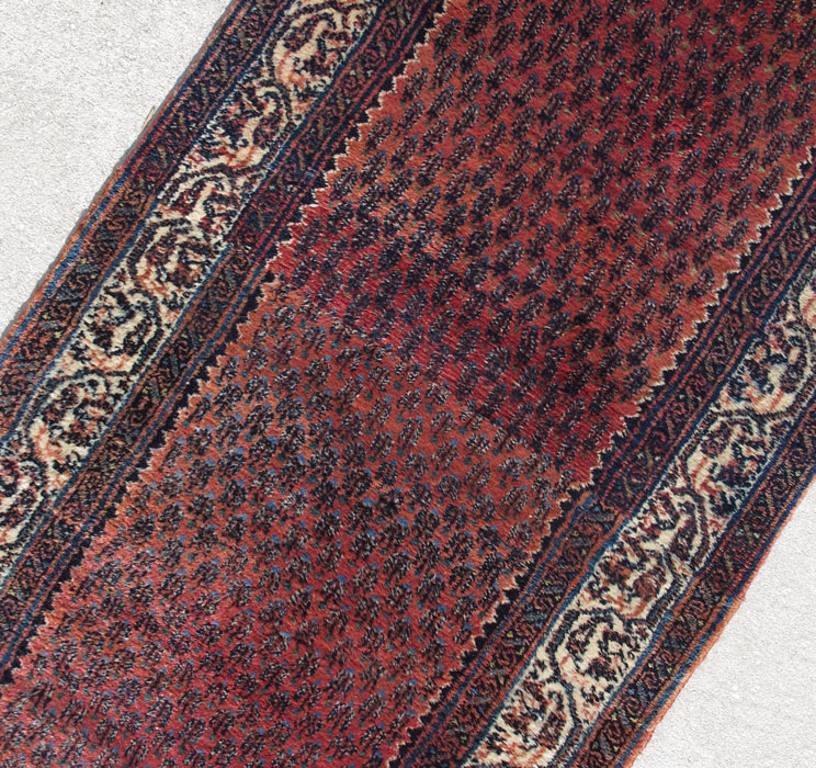 SEMI-ANTIQUE PERSIAN SERABAND RUNNER, 4'8'' x 19'11'': This extra long Serab runner is actually two matching runners that were professionally put together. The design of small botehs or paisleys in rows covers the tomato red field. The main border has a beige ground with a traditional design of vines with botehs that run around the field. This runner could be used on a wide staircase or a gallery type hallway, looks good while being very durable.