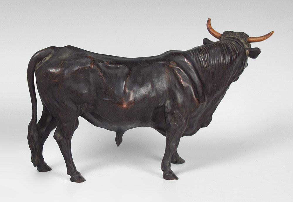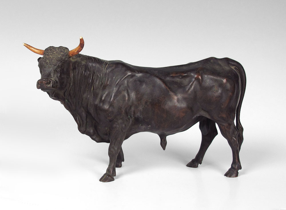 WELL MODELED LATE 19TH EARLY 20TH CENTURY BRONZE BULL: No visible signature, 8 3/4'' h., with the ivory horns which have damage, 14''l.