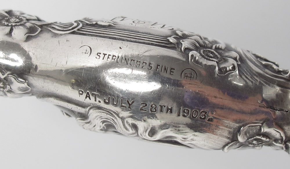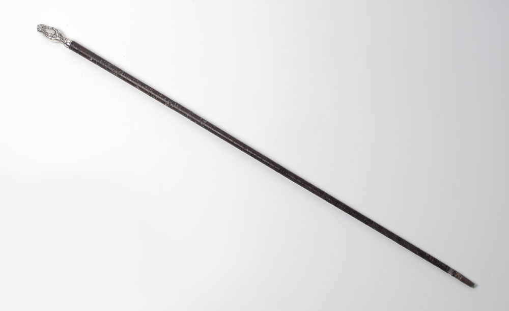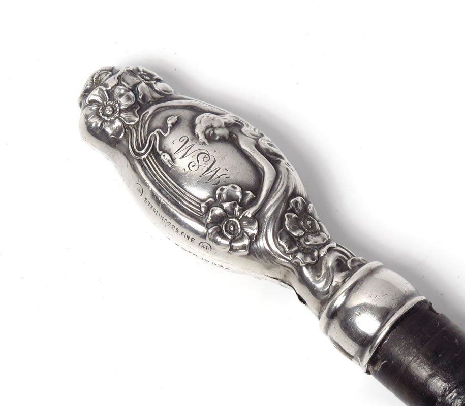 UNGER BROTHERS STERLING HANDLE WALKING STICK: Sterling handle in the Reine des Fleurs (Queen of the Flowers) pattern, marked Unger Brothers, Sterling, 925 Fine and Pat. July 28th, 1903. Monogrammed. Leather wrapped shaft, brass tip. Overall 34'' long.
