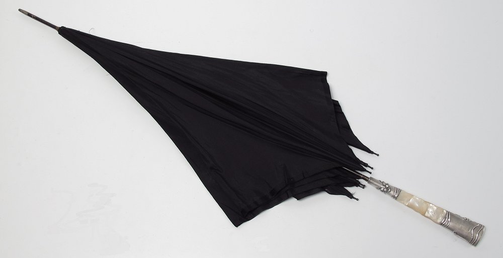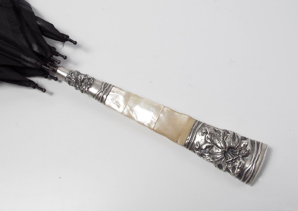 STERLING & MOTHER OF PEARL HANDLE PARASOL: Art nouveau floral pattern sterling pommel and collar with mother of pearl. Marked Sterling. 37'' l. overall.