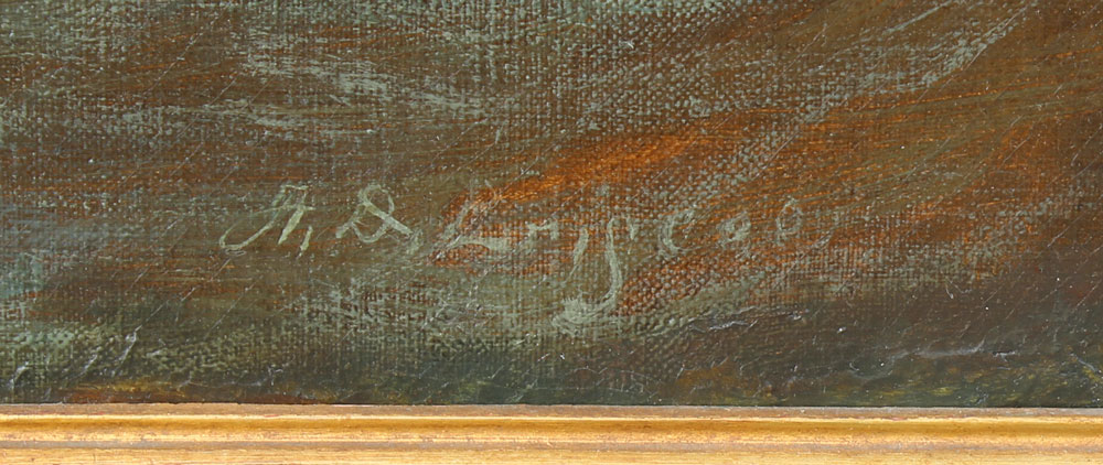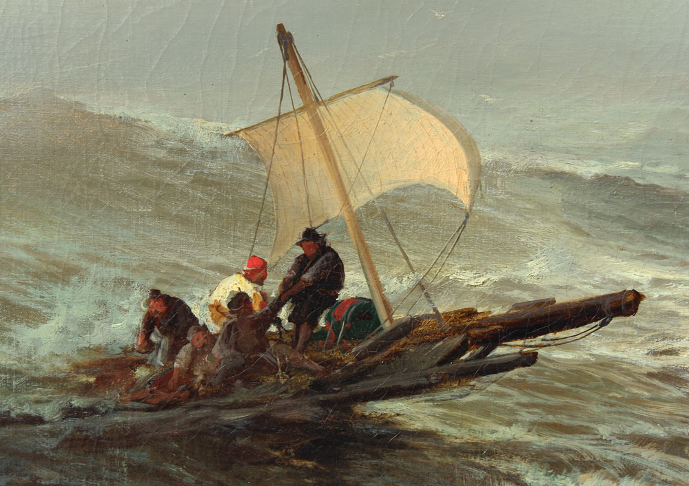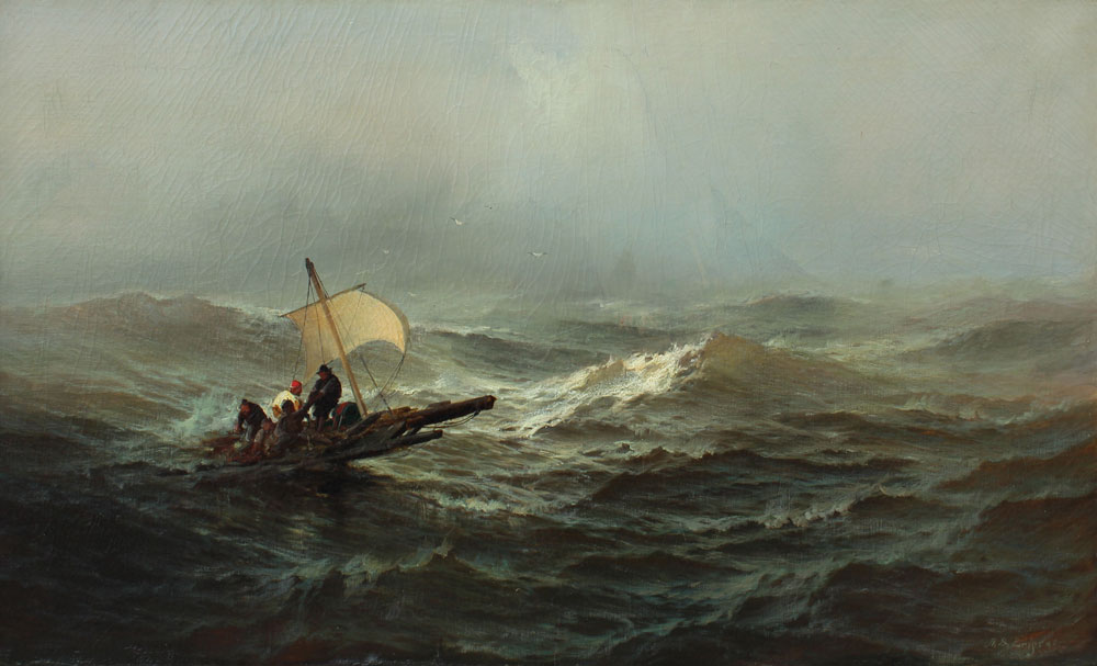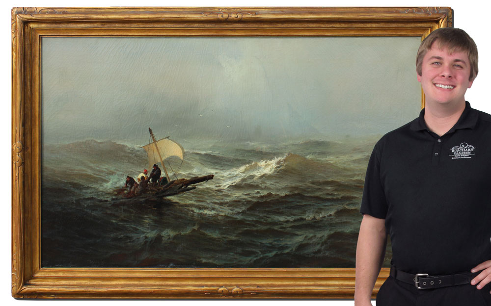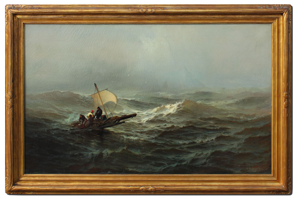 BRISCOE, Franklin Dullin, (American, 1844-1903): Life Raft Sailing for Rescue in Stormy Seas, Oil/Canvas, 30'' x 50'', signed lower right, encased in gorgeous period foliate carved and gilded frame with minor wear. Constructed in the manner of Newcomb Macklin, 37'' x 57''.