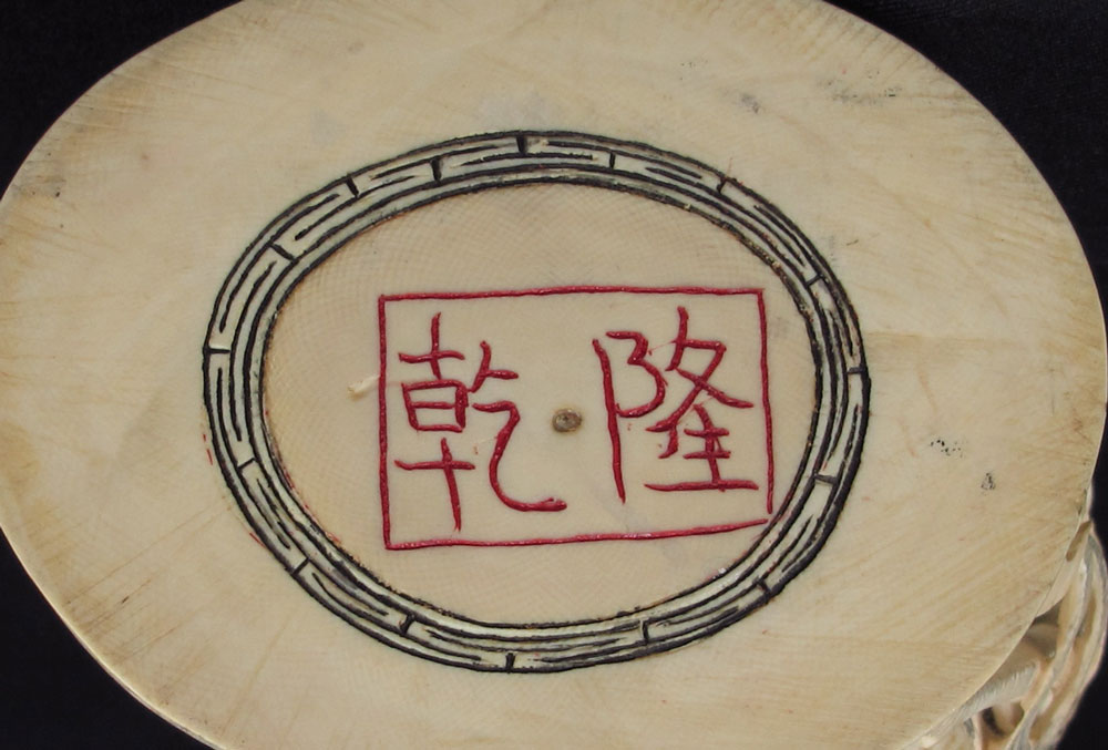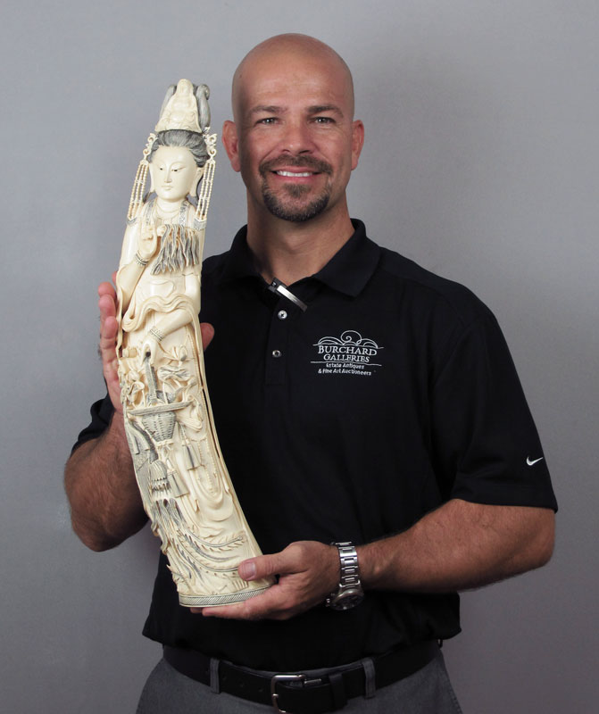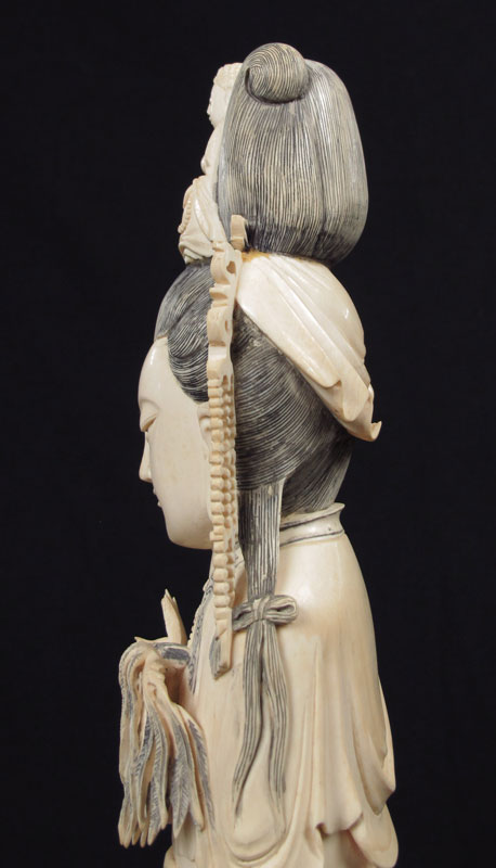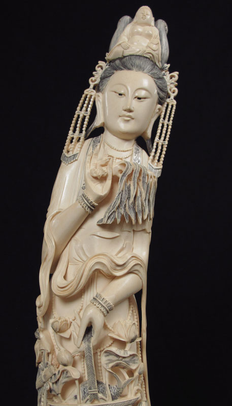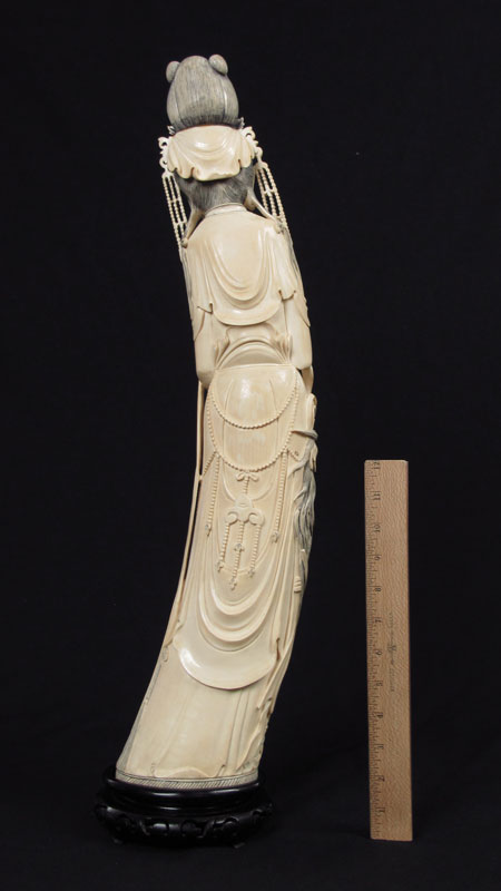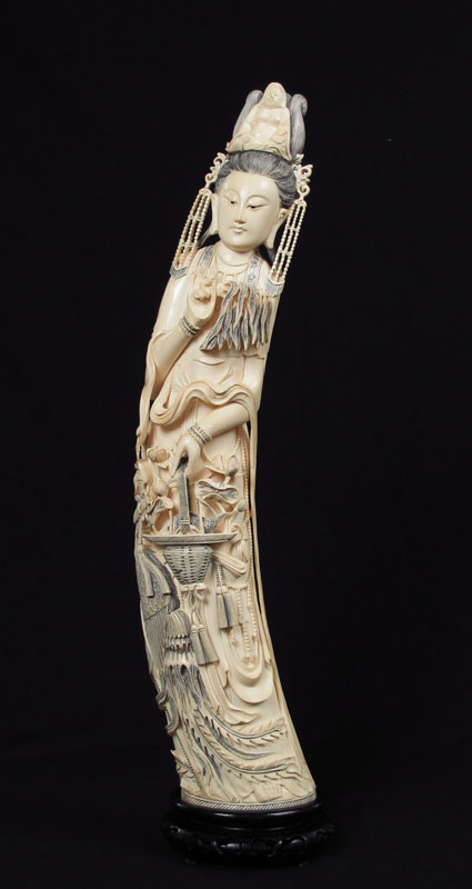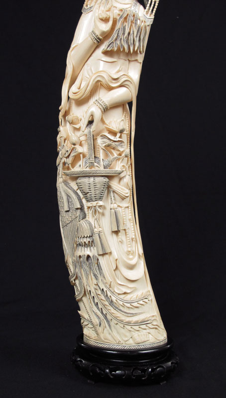 MONUMENTAL FIGURAL CARVED IVORY WOMAN: Headdress is figural seated Buddha, floral hairpieces extending to shoulder, she is holding a flybrush whisk in one hand and basket of flowers in the other with a figural rooster at her feet. Signed in characters on base, overall 24 1/2'' high x 6 1/2'' x 3 5/8''. Sold with carved wood base, 2'' high x 6'' x 5 3/4''.