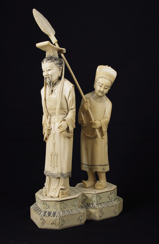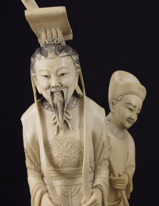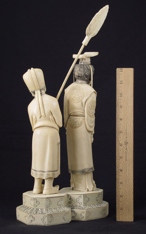 CARVED IVORY ROYAL GENTLEMAN WITH ATTENDANT: Large carving of a royal gentleman holding carved decoration, figural attendant behind holding removable fan on pole. Both affixed to ivory clad base signed in characters. Measures overall 17 7/8'' h. x 7 1/2'' x 4''.