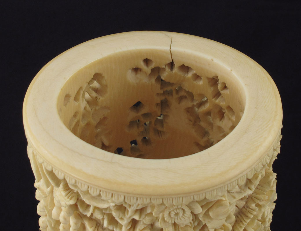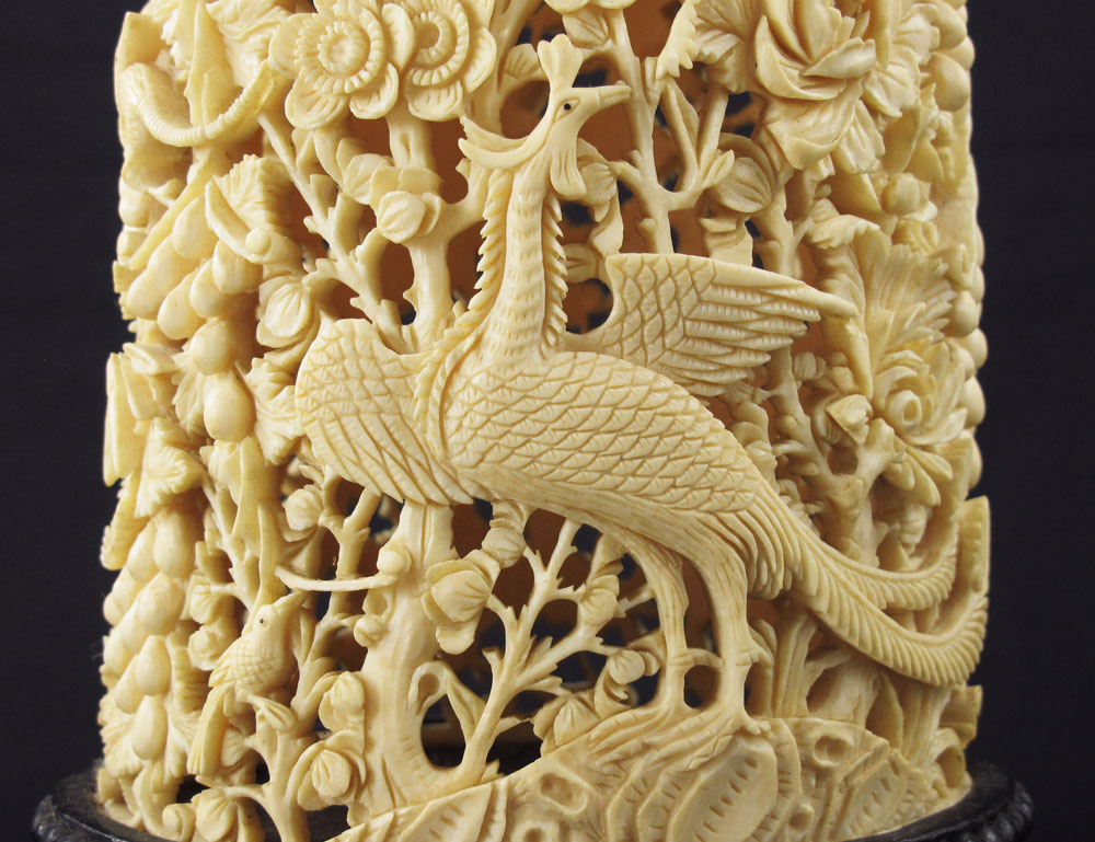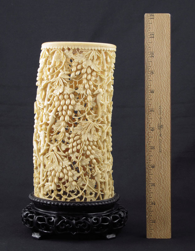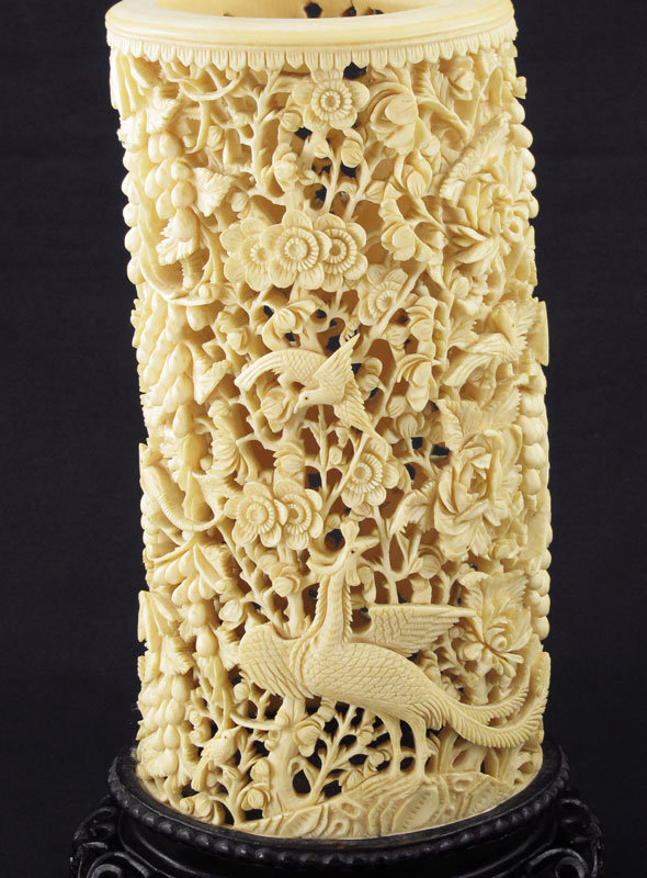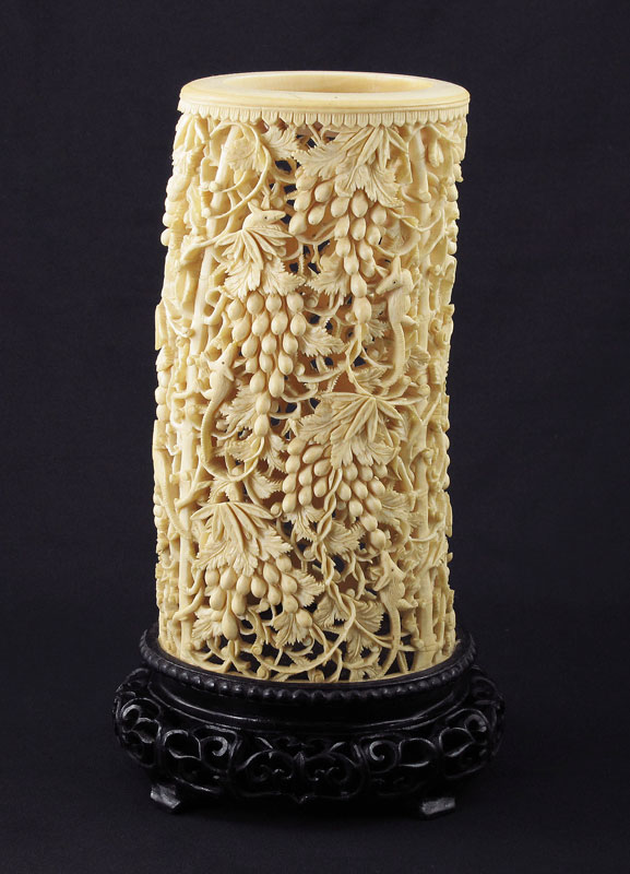 LARGE CARVED AND PIERCED IVORY BRUSH POT: Carved and pierce work ivory tusk brush pot with figural birds of paradise, fruit, animals (most likely opossums), and floral motifs. Affixed to carved wood base. Overall measures 10 1/2'' h. x 6'' h. x 4 7/8''.