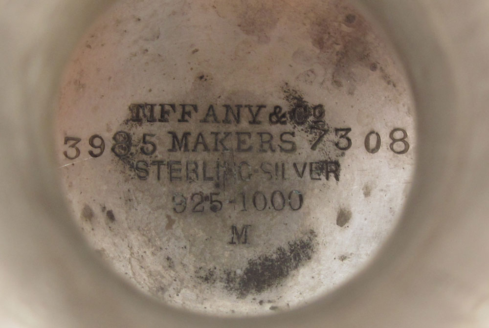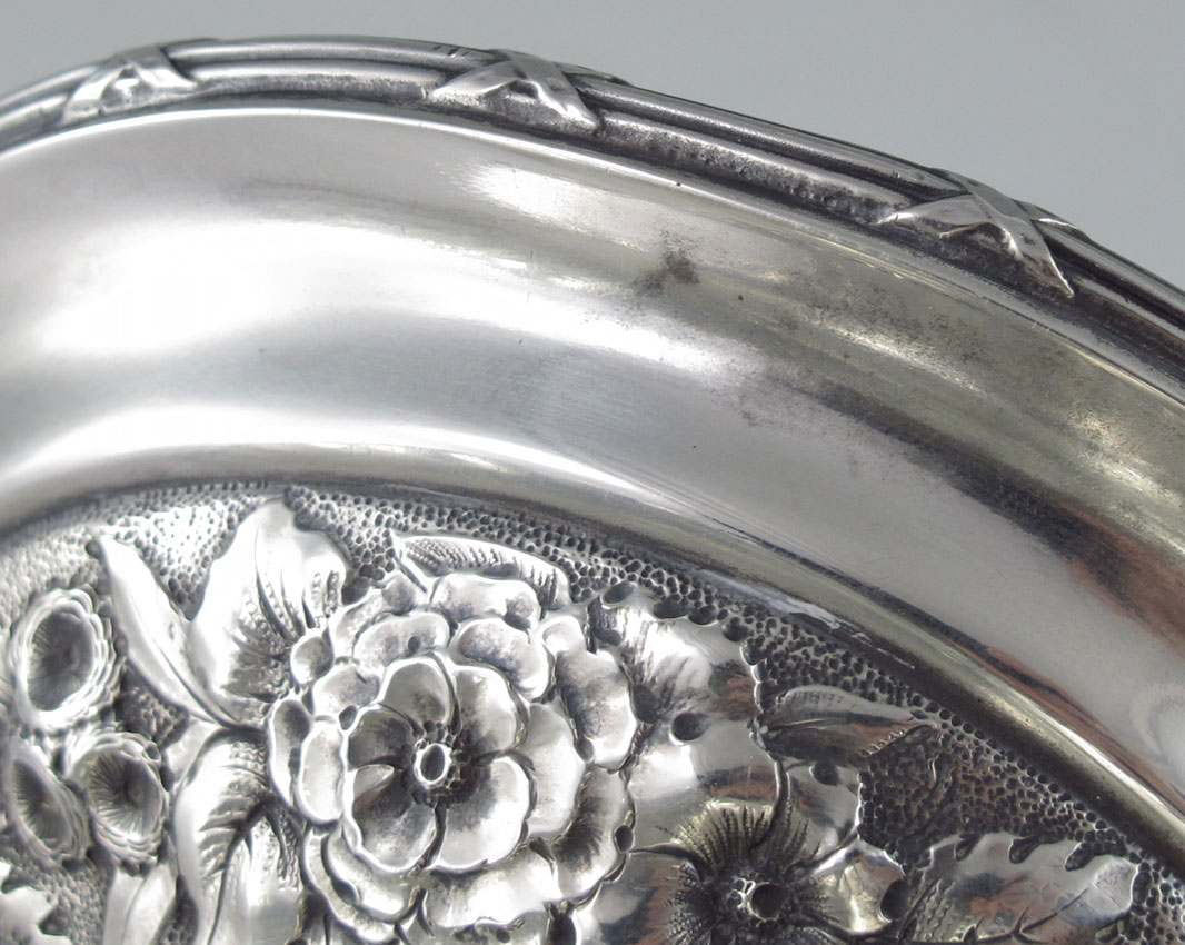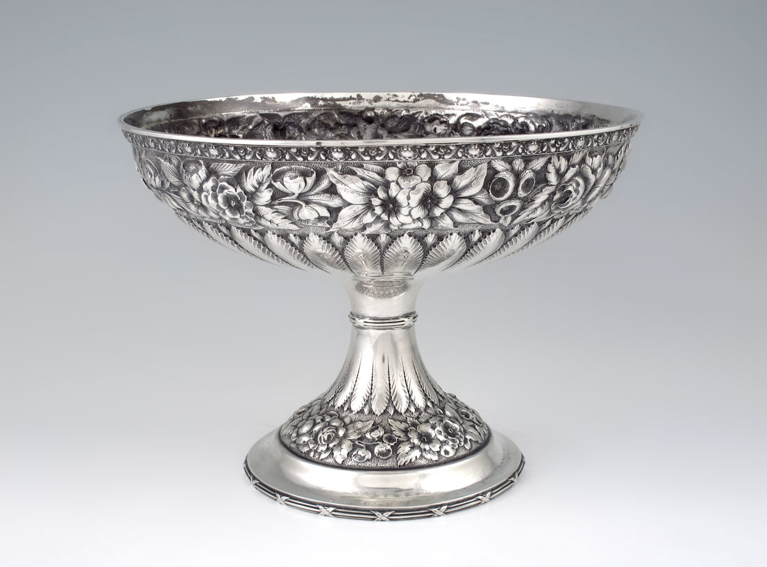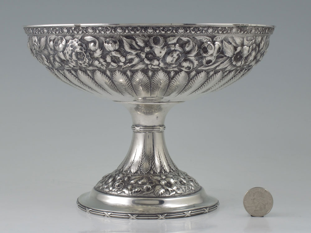 TIFFANY & CO. STERLING REPOUSSE PEDESTAL BOWL: Floral motif pedestal or center bowl marked Tiffany & Co., 3985 Makers 7308, Sterling Silver, 925-1000, M. 6 1/4'' h. x 8 1/2'' dia. Approx. 14.3 troy oz.
