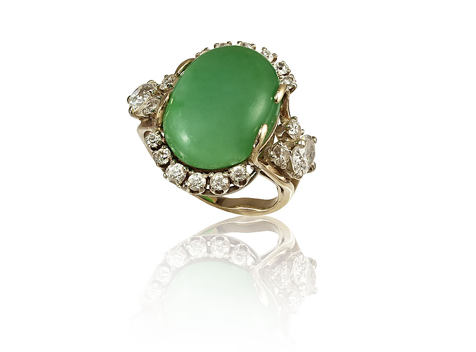 JADE & DIAMOND RING: 14K yellow gold ring centers one 16.50 x 12.50 mm piece of green jadeite jade. Framing the diamond and in the shank are 20 old European, old mine and round full cut and single cut diamonds totaling approx. 1.75 Ct. The diamonds average VS-SI in clarity and H-I-J in color. The jadeite and diamonds are prong set. Size 6. Weight: 7.5 grams