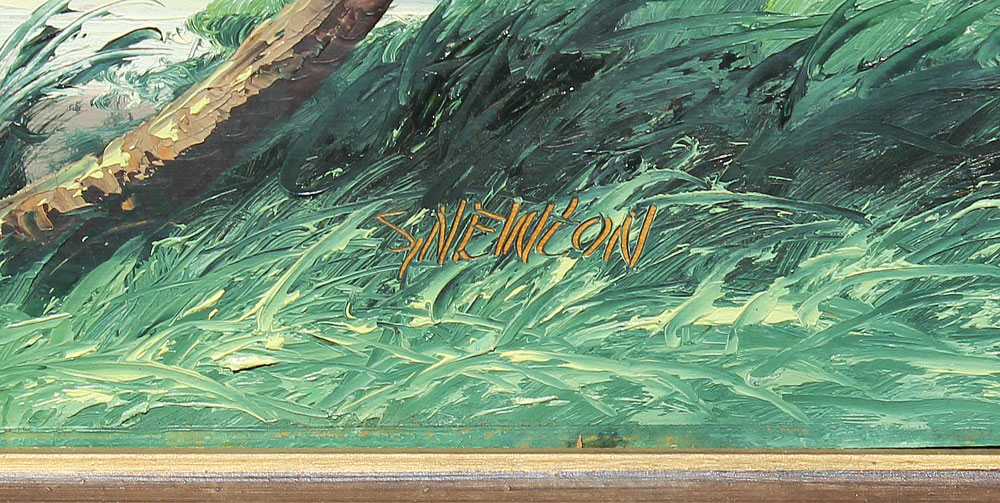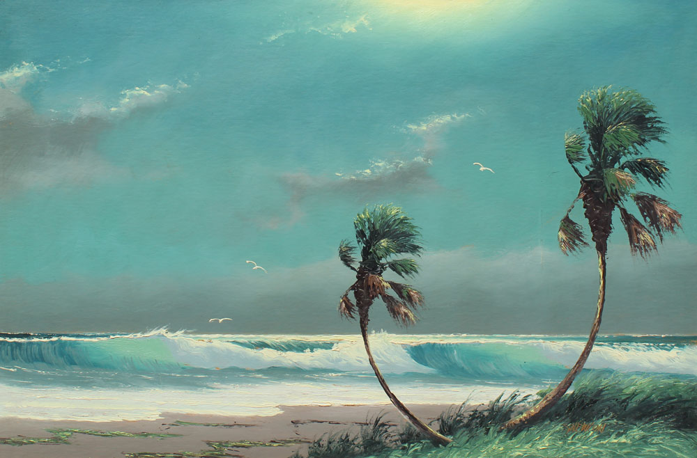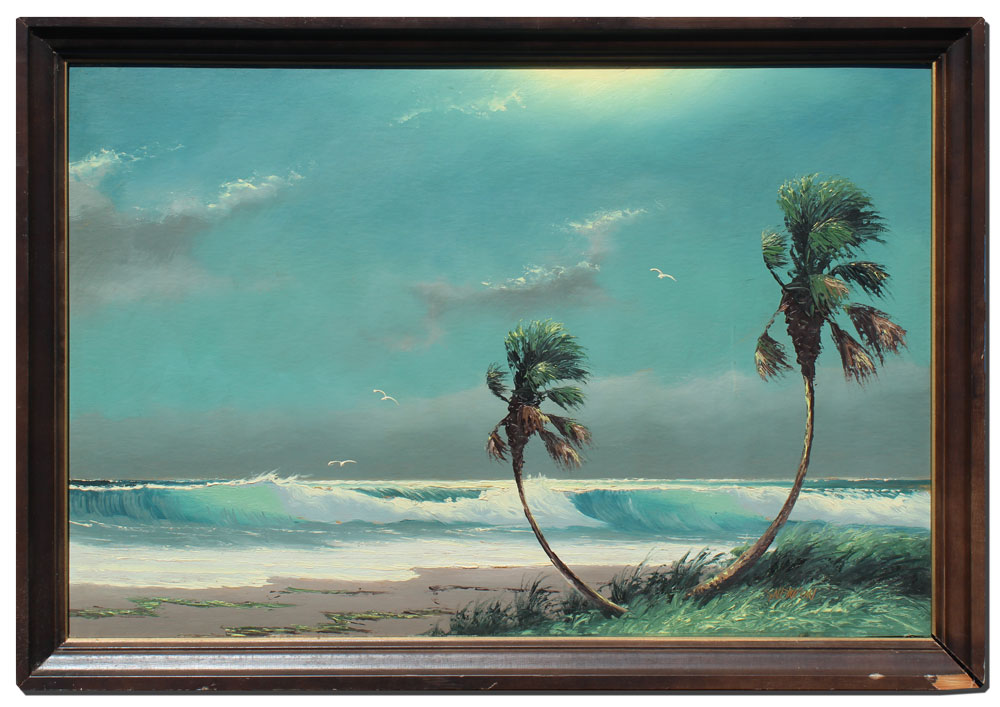 NEWTON, Sam, (American, 20th Century): Florida Highwaymen Panoramic Beach Scene, Oil/Upson Board, 24'' x 36'', signed lower right, period wooden frame with damage lower right corner, 28'' x 39 1/4''.