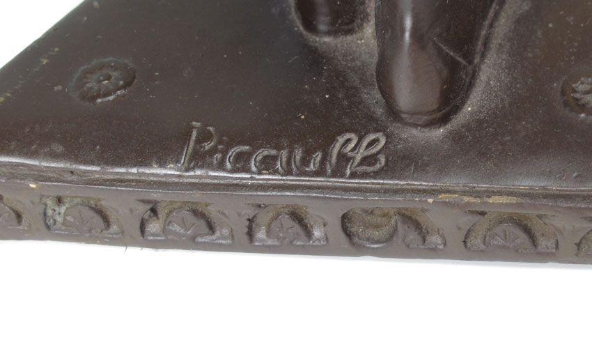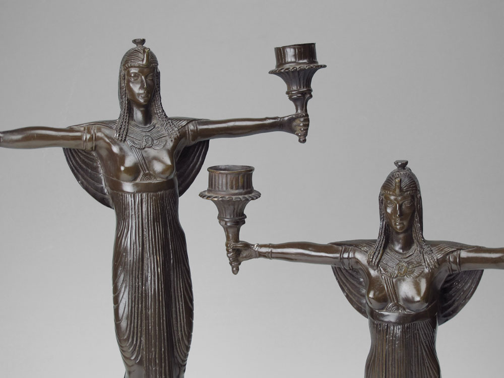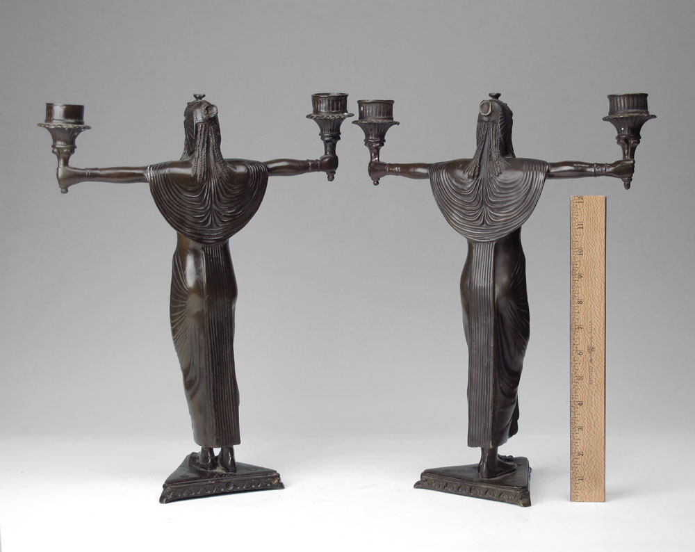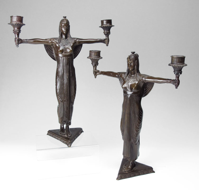 PAIR BRONZE EGYPTIAN REVIVAL CANDELABRA, AFTER PICAULT: Pair 2 light candelabra in the form of seminude Egyptian women with outstretched arms. Signed Picault. Measures 16'' h x 13 1/4''.