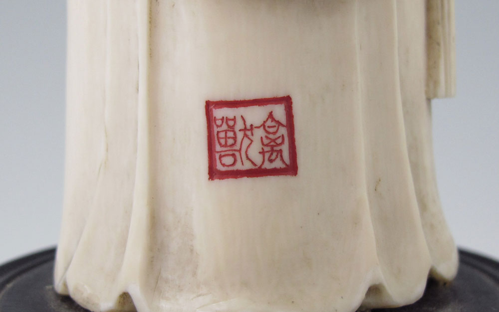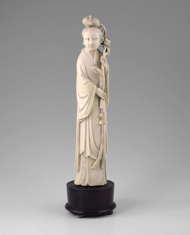 CHINESE CARVED IVORY FIGURAL MAIDEN: Figural maiden holding branch with flower, signed in characters at base, 10 1/4'' h. Affixed to wood base, overall 12'' h. x 3 1/8''.