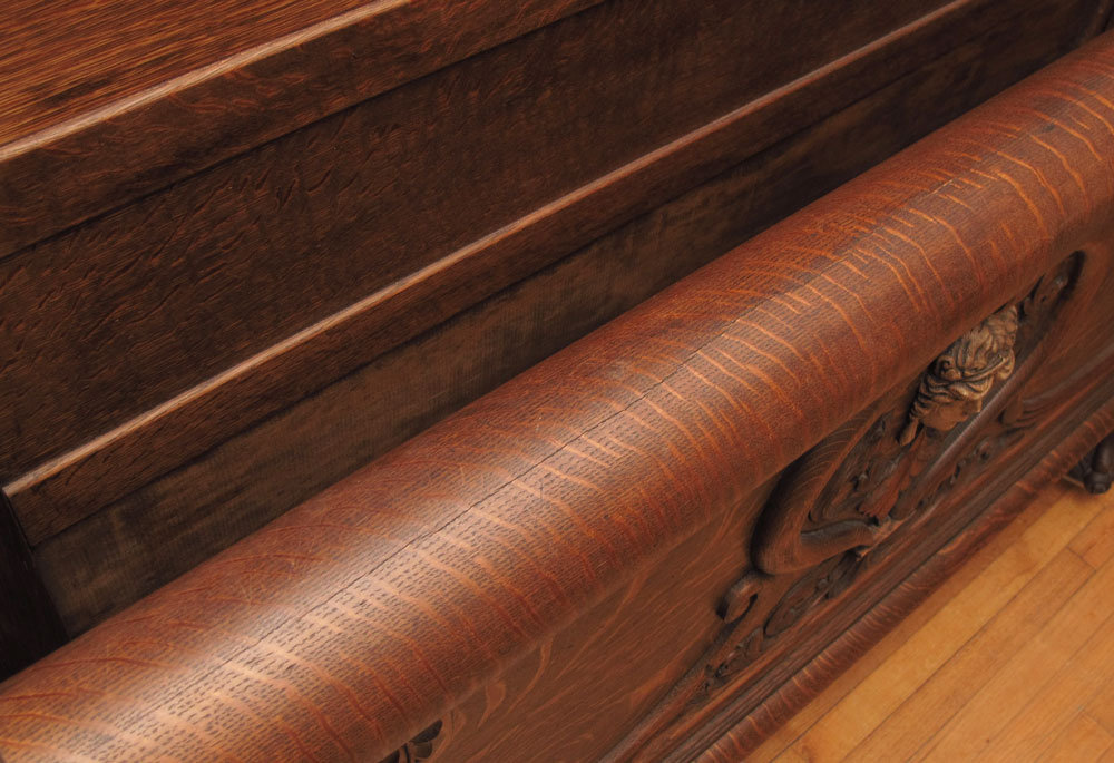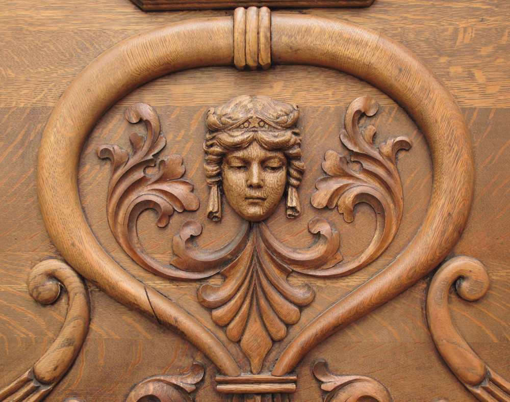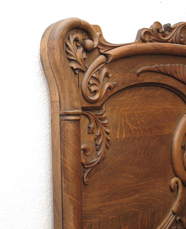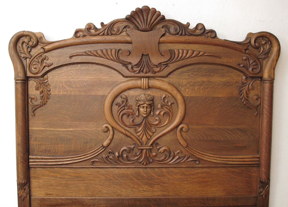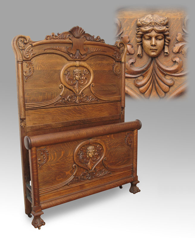 KARGES 7 FT TALL VICTORIAN QUARTER SAWN OAK BED: Ca.1900. Columnar stiles, paw feet and a maiden masqueron at the center of the head and foot boards. Rails are not original as the bed has been converted to accept queen size mattress. The matching dresser with the Karges label is at the next lot, #24.
