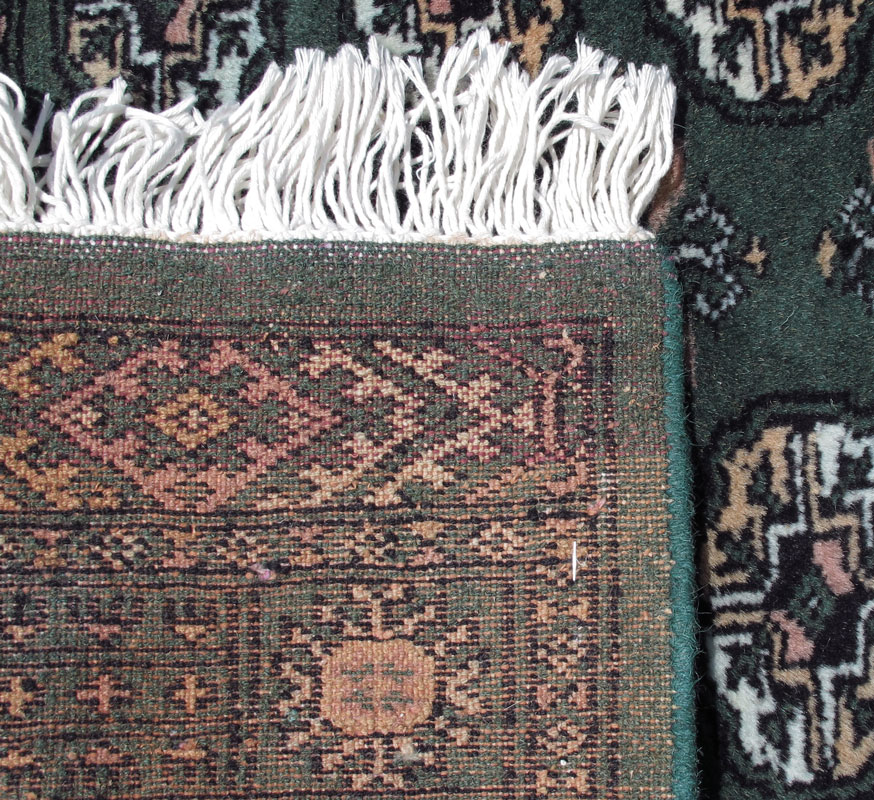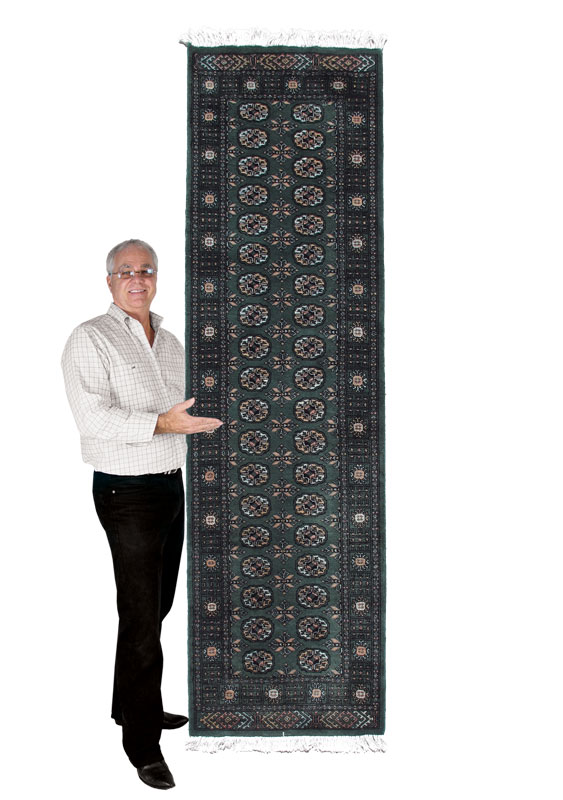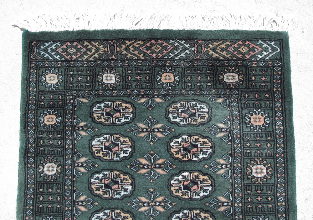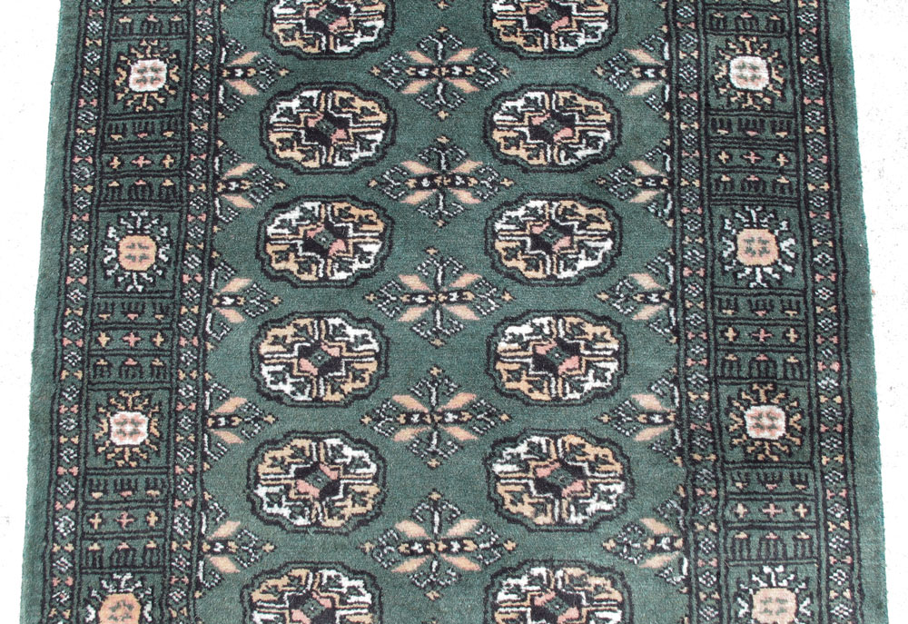 MODERN PAKISTANI BOKHARA HAND KNOTTED WOOL RUNNER, 2'7'' x 8'1'': This runner uses traditional design motifs found on Bokharas, but it is different because it is basically an all green rug. Green is usually not a predominate color because it is sacred to Allah. So this runner is a great opportunity for someone who using green in their decor. Condition is good.