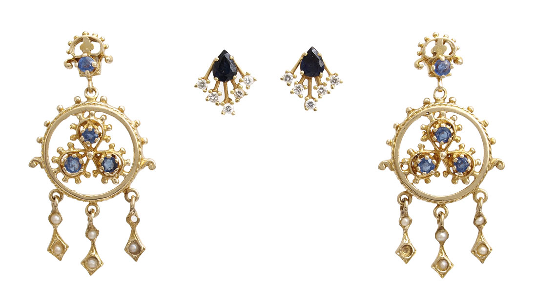 2 PAIR SAPPHIRE EARRINGS: 1) 14K yellow gold stud earrings contain 10 round full cut diamonds totaling approx. .25 Ct., rated VS in clarity and H-I color. The two pear shaped sapphires total approx. 1 Ct. 2) The second pair of earrings are not gold, though they do have 8 sapphires of approx. 1 Ct., and seed pearls (one missing from each) Post and nut closures.