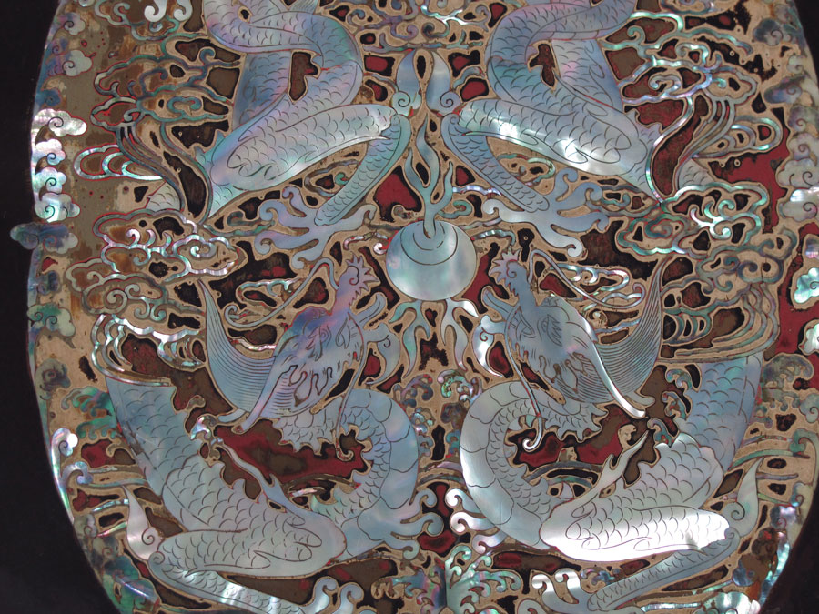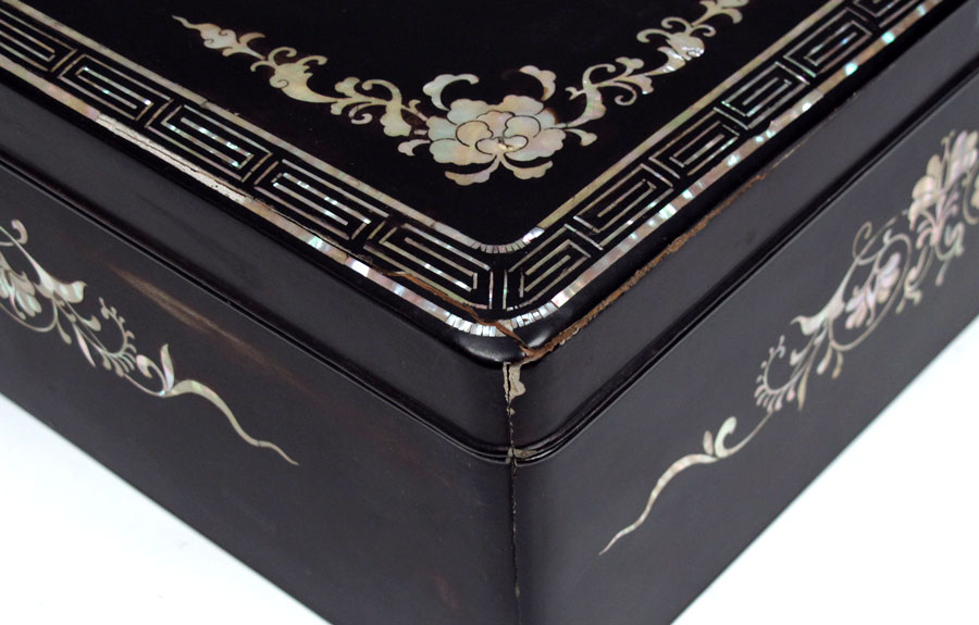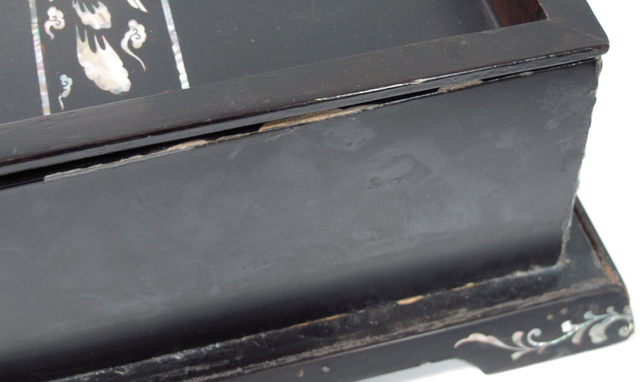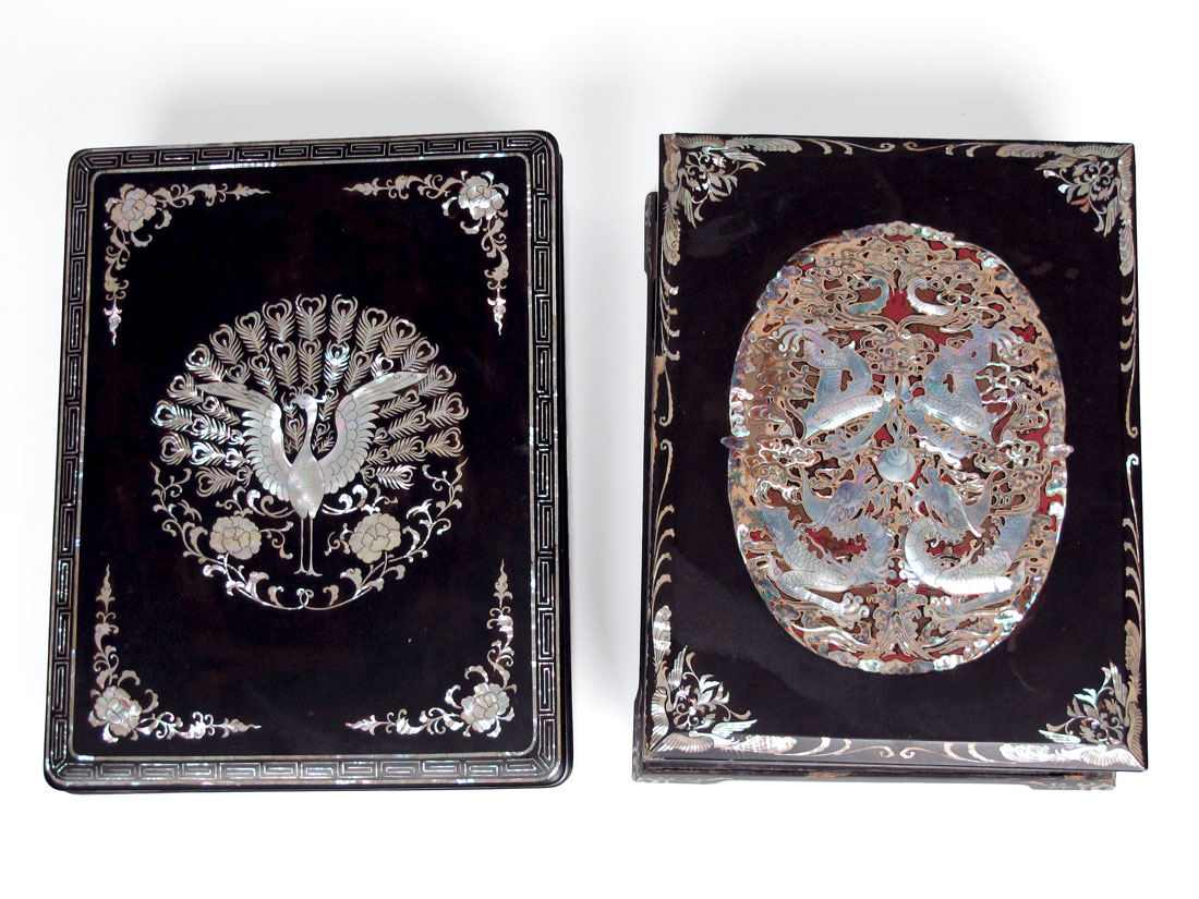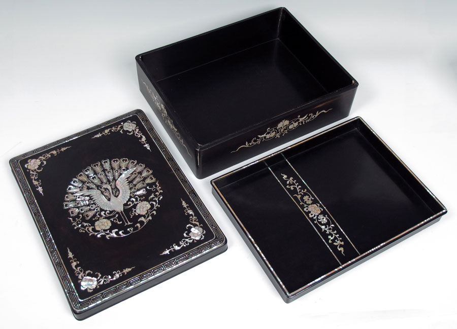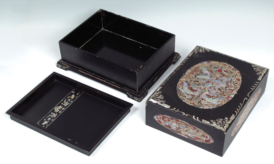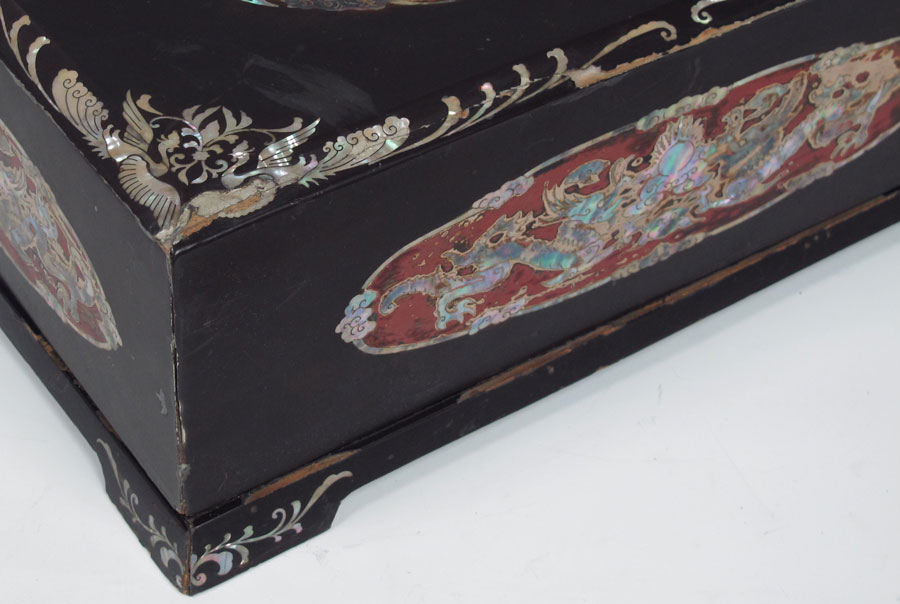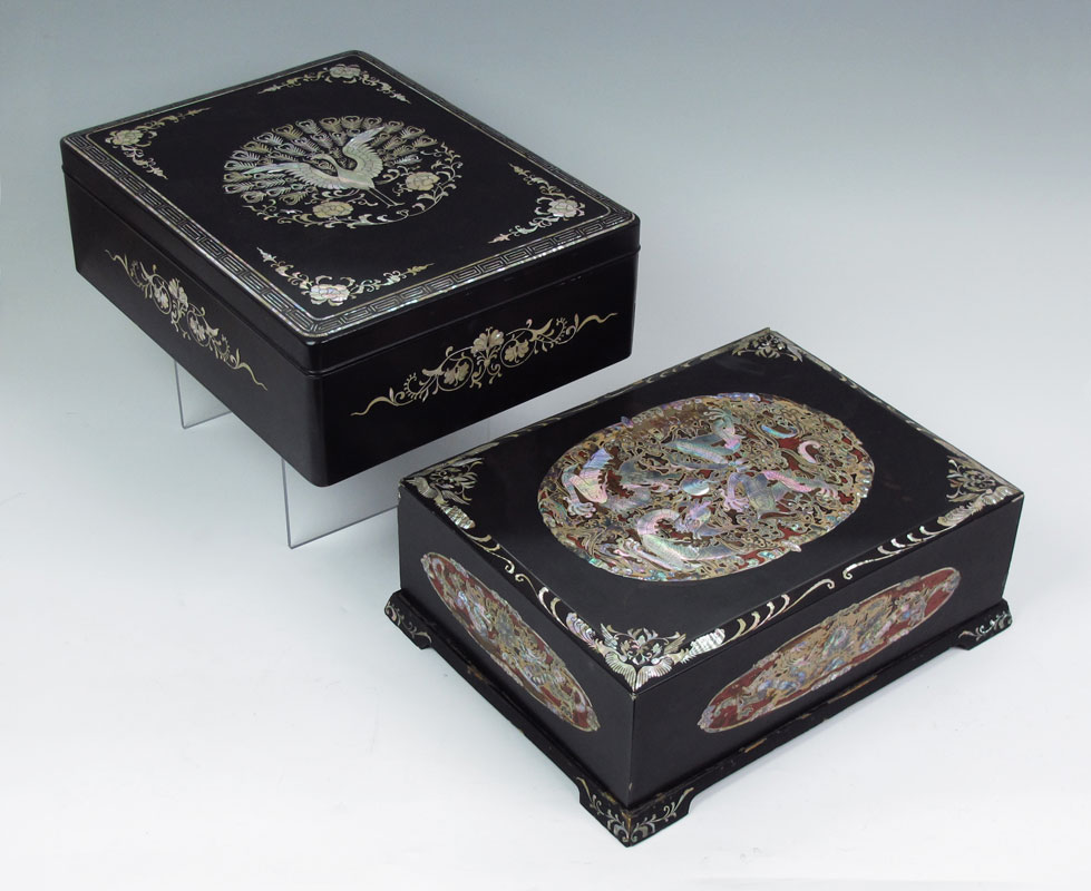 TWO JAPANESE MOTHER OF PEARL INLAY LACQUER BOXES: To include 1) Mother of pearl inlay decoration to include peacock on lid, floral motif on sides and internal tray. Measures 5 1/4'' x 16'' x 12 1/2''. Note loss of lacquer at corner. 2) Detailed dragon motifs in red lacquer medallions on top and sides. Bird motif on interior tray. 5 3/4'' h. x 16'' x 12 1/2''. Note loss of lacquer in several spots, loss of inlay on lid corner.
