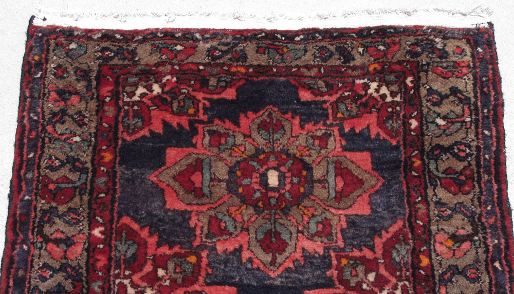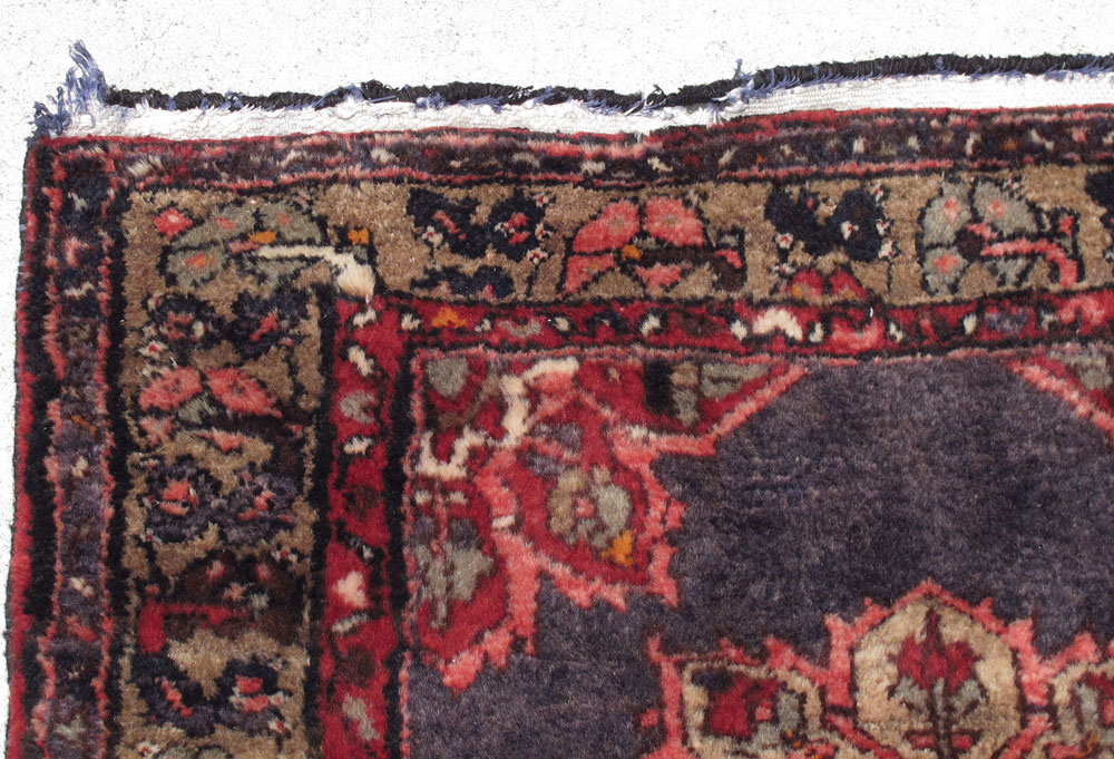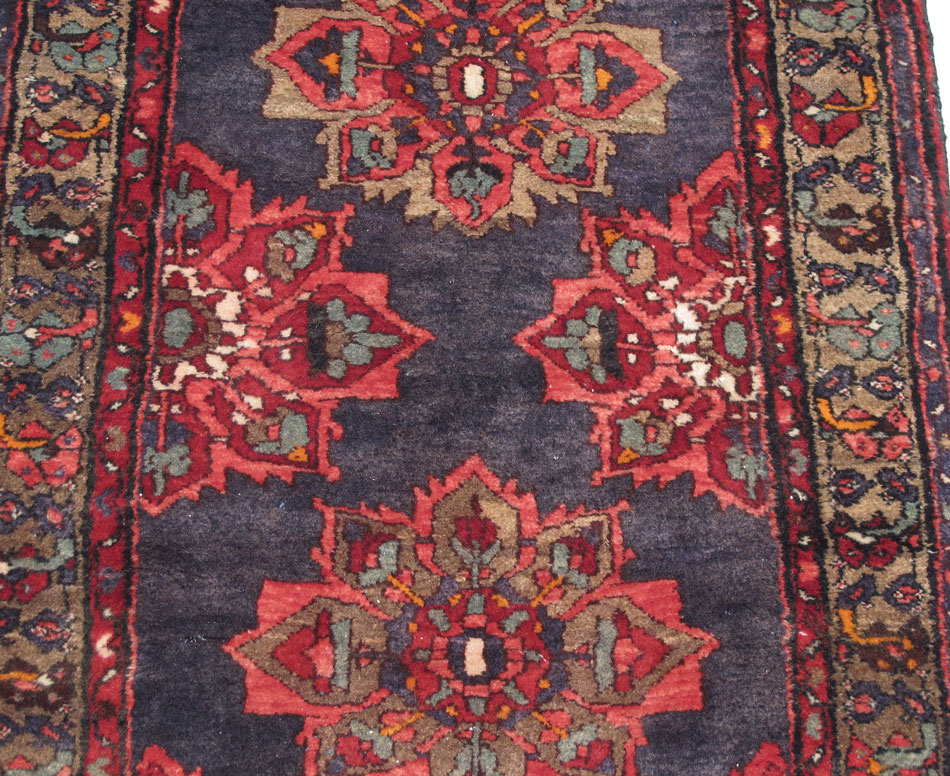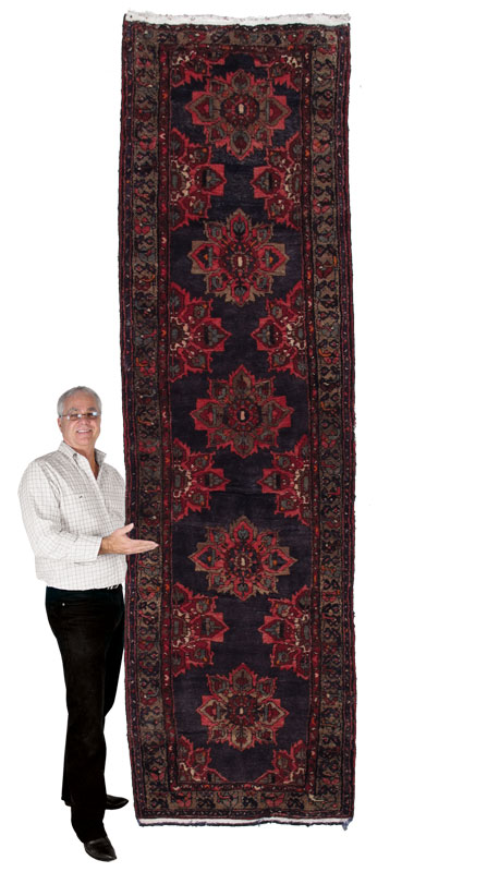 SEMI-ANTIQUE PERSIAN HAND KNOTTED WOOL RUG, 3'3'' x 10'7'': This runner has a striking design of star-like medallions and half medallions on a black field. The peachy-pink edge and outline of the medallions makes for a vivid contrast that is very attractive. The beige ground of the main border completes the picture.