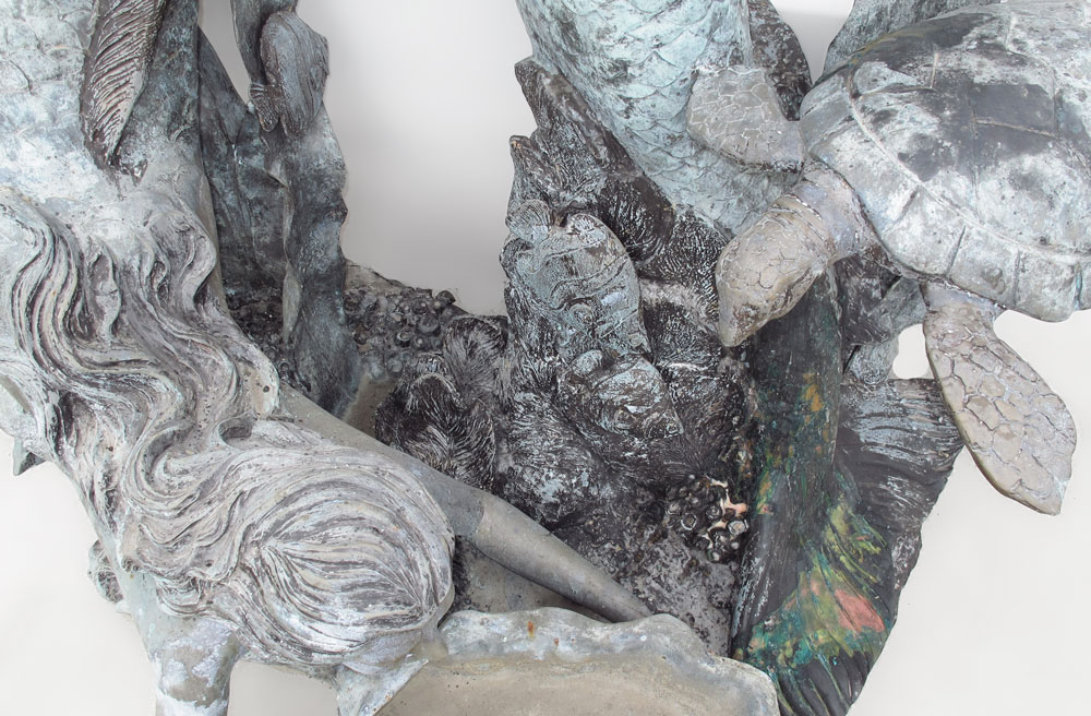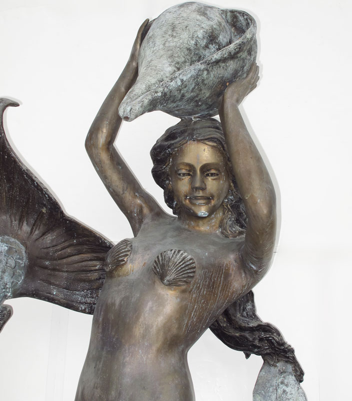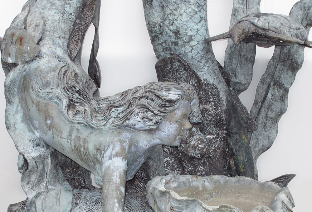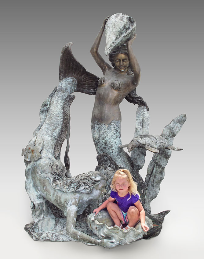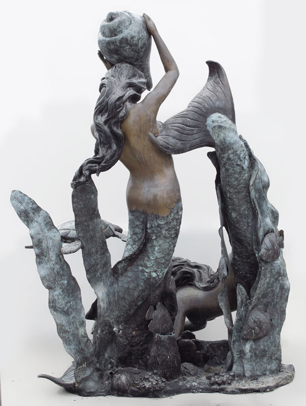 MAJESTIC UNDER THE SEA BRONZE FOUNTAIN: Two lively mermaids and sea turtle among the shells and coral. Approx. 7 Ft. tall x 5 Ft. x 4 Ft.