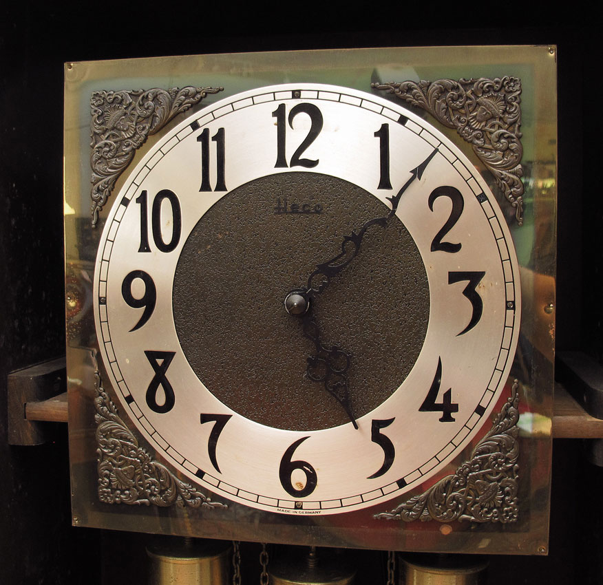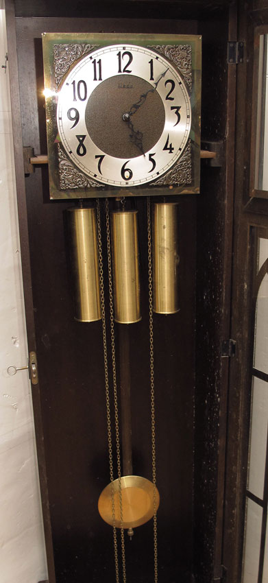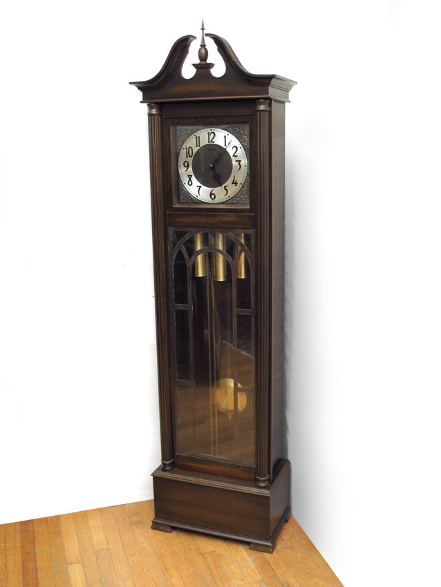 HECO GERMAN LONG CASE CLOCK: Broken arch pediment, spire finial, mixed metal dial. Triple weight time and strike movement. Fluted 3/4 columns on door. 79 3/4'' h. x 21 3/4'' x 12 1/4''.