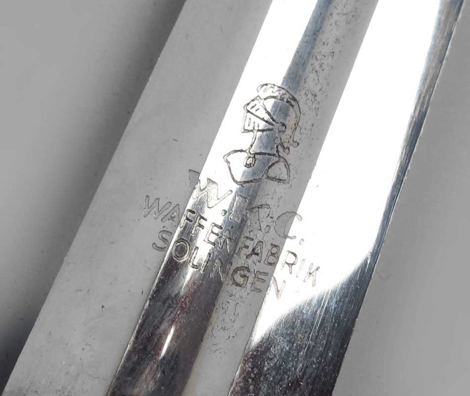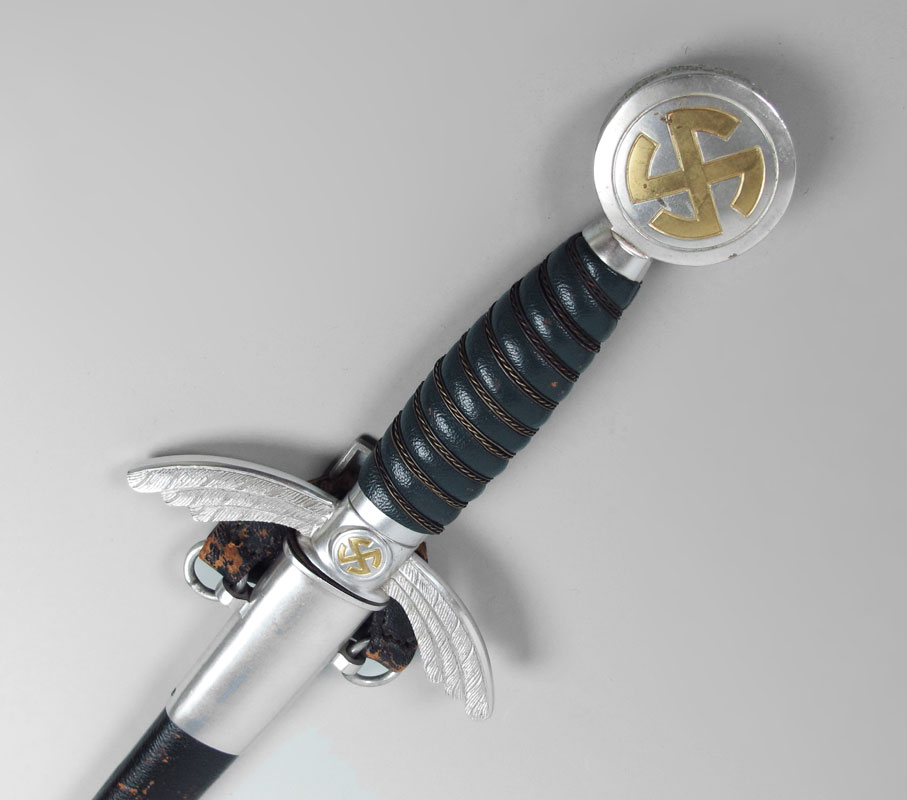 WWII GERMAN LUFTWAFFE OFFICERS SWORD: Aluminum hilt with blue leather wrap and original wire. Near mint 30 1/4'' blade marked with knight head, WKC, Waffenfabrik, Solingen, retains leather throat. Original scabbard with aluminum mounts, blue leather over wood body. Retains original frog and hanger. Sold with cloth and leather sword case that appears to be a replacement due to length. Overall 39 1/2'' long.