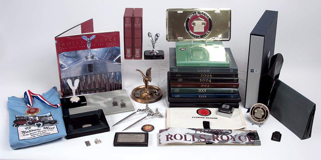 COLLECTION OF ROLLS ROYCE MEMORABILIA: To include Desk Diary books from 1999, 2001, 2004-2007; Silver Seraph book; ''Rolls Royce, The Best Car in the World'' book by John Heilig and Reg Abbiss; handbag, Owners Club legal pad holder, ''The Goodwood Phantom'' book by Malcolm Tucker; ''2004, The Centenary Year'' book; Owners documentation book; tape measure, change purse, 2 letter openers, 2 desk statues, ashtray, and other assorted items.