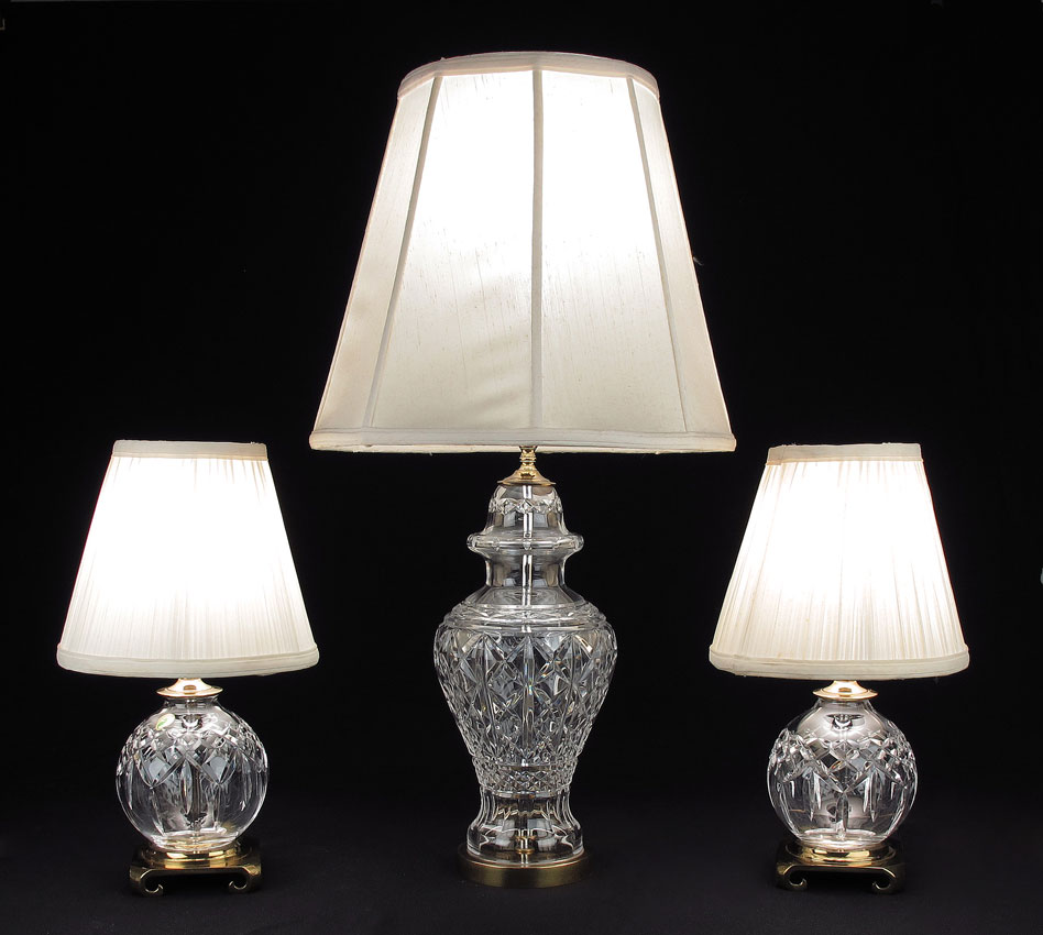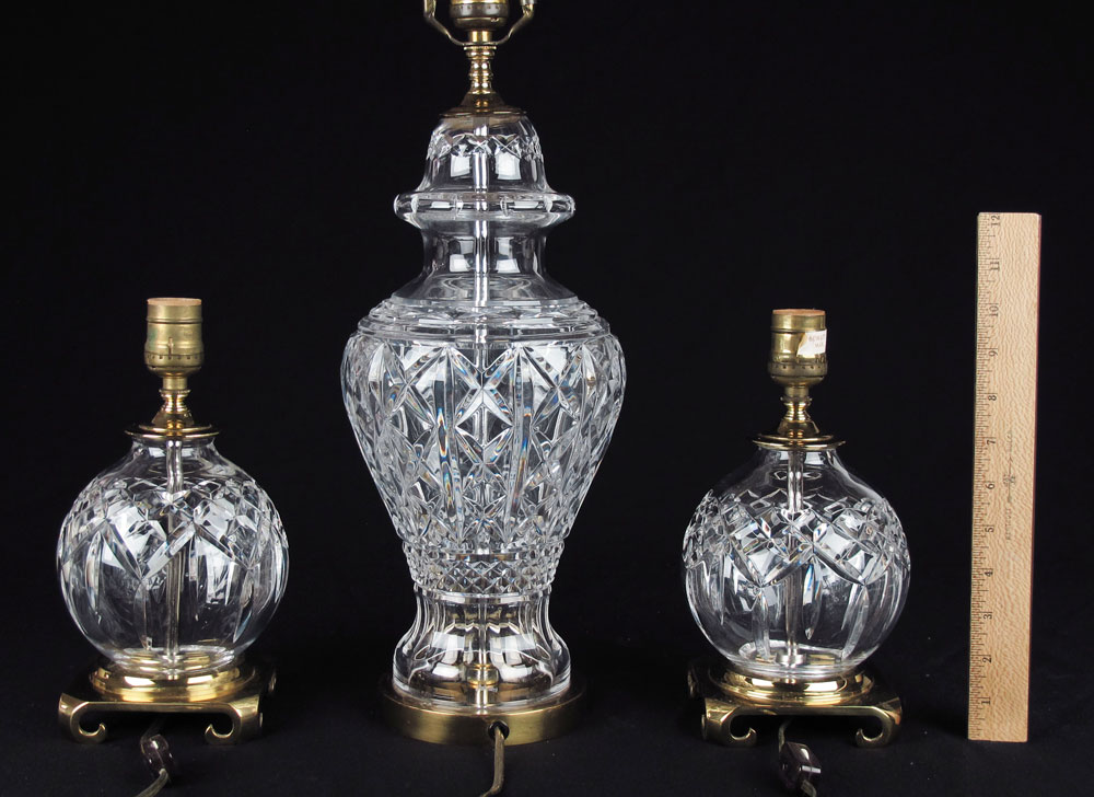3 WATERFORD CRYSTAL LAMPS: Pair of boudoir lamps, 15'' tall, foil labels. A vase form table lamp, 27'' h., signed Waterford.