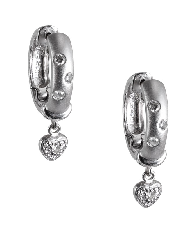 GOLD AND DIAMOND HUGGIE EARRINGS: 14K white gold earrings contain 8 round brilliant cut diamonds. Weight: .15 Ct. Approx. The diamonds average SI-I1 in clarity and H-I in color. The diamonds are prong and deep set. Post and hinged huggie hoops. Weight: 2.6 grams.