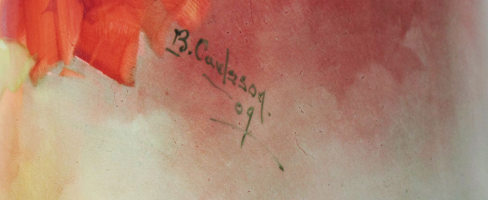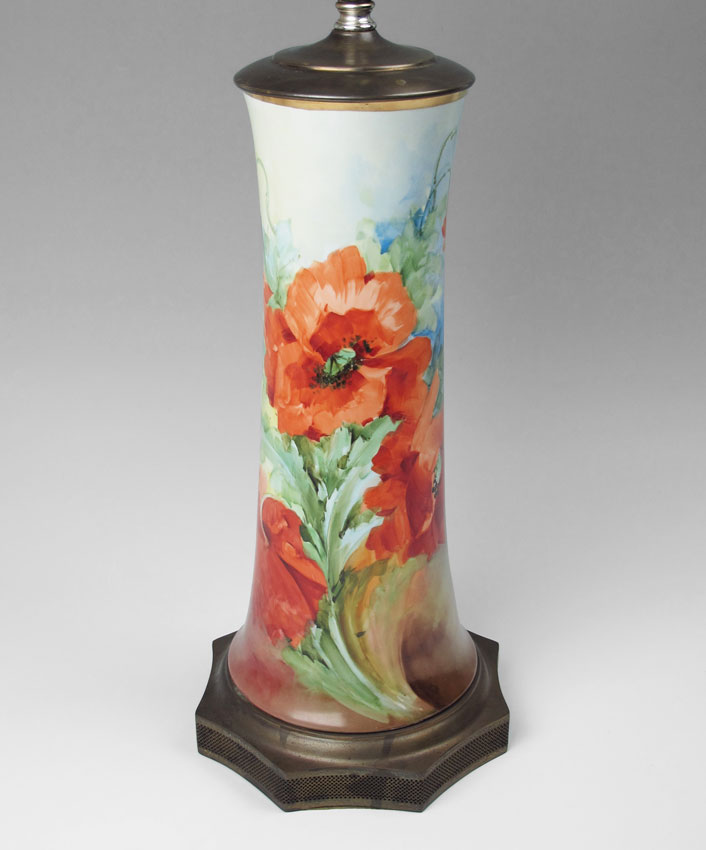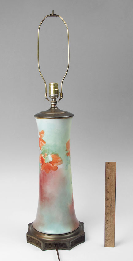 B. CARLSSON HAND PAINTED LIMOGES PORCELAIN VASE / LAMP: Beatrice Carllson was a sought after china decorator with a studio in Chicago, Ca. 1908-1911. This piece is signed B Carllson and dated 09. Believed to be Limoges. We have not removed it from the base. Porcelain measures 16'' tall. The lamp with harp, 32''.