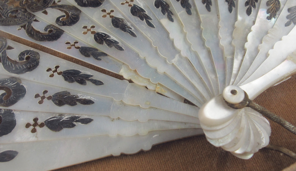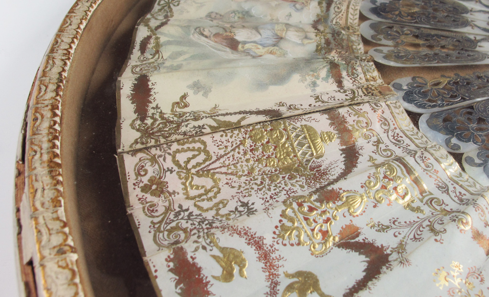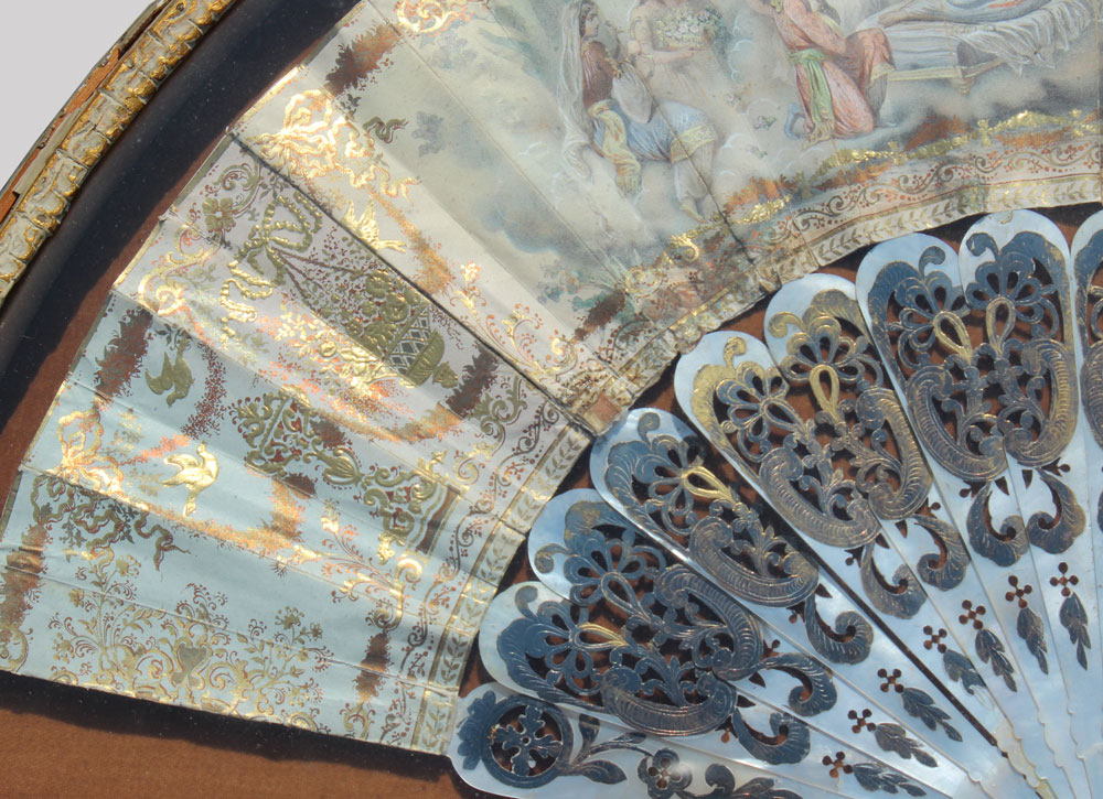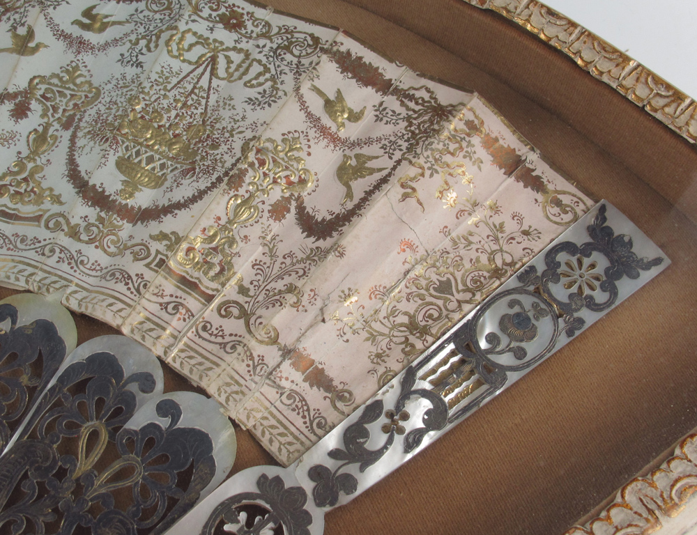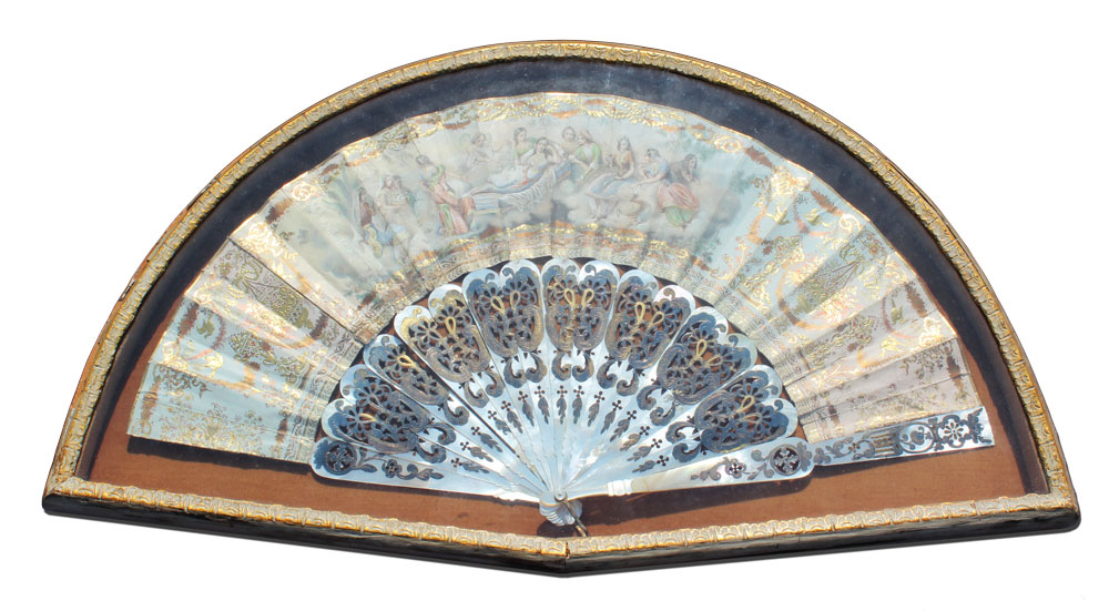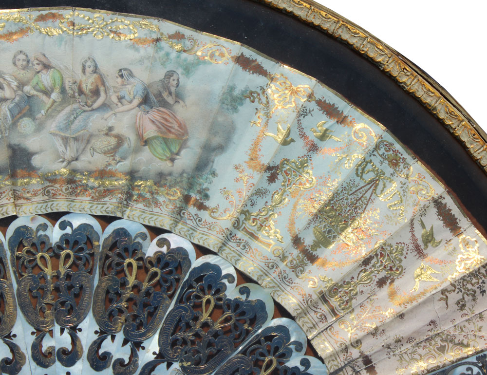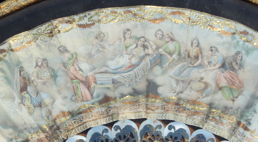 19TH C HANDPAINTED ORIENTALIST FAN IN FRAME: Mother of pearl with Harem scene with opalisque and suitor, 10'' x 20'', encased in shadow box frame, 13'' h., 23 1/2'' w.