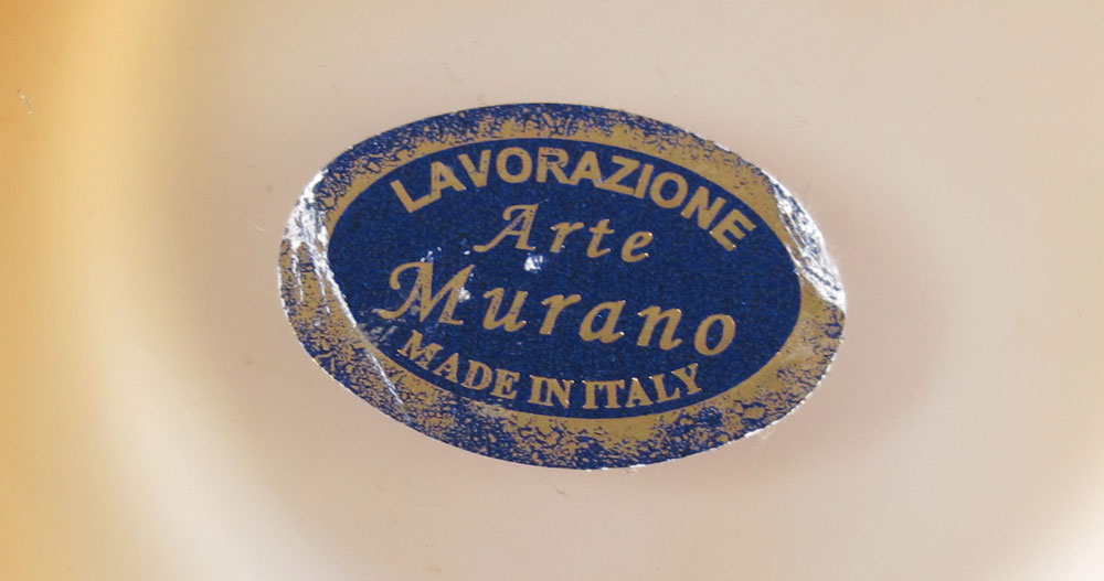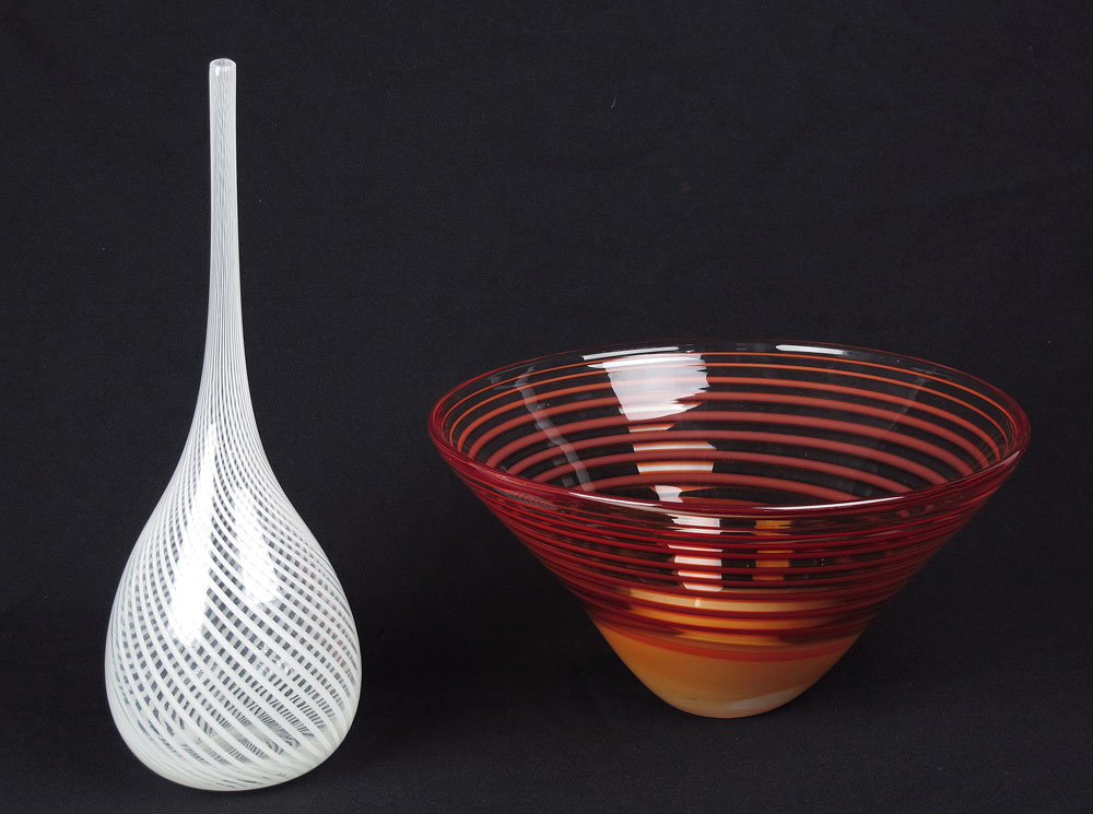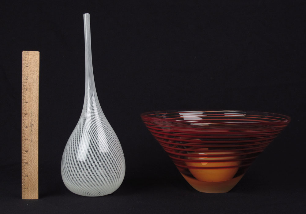 LAVORAZIONE ARTE MURANO GLASS BOWL AND VASE: Large amber to clear glass bowl with spiral orange cane in two shades, 6 3/4''h. x 13''dia. and delicate bulbous vase with narrow neck, parallel white canes in a swirl pattern, approx. 15 1/2''h. Both with foil Murano Made in Italy labels.