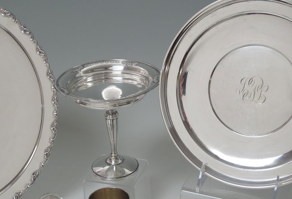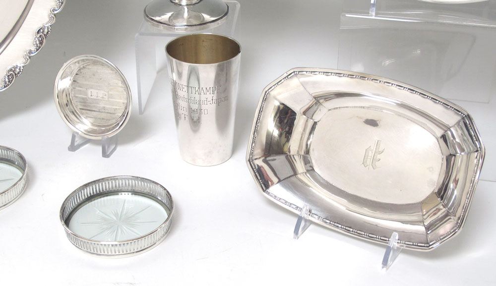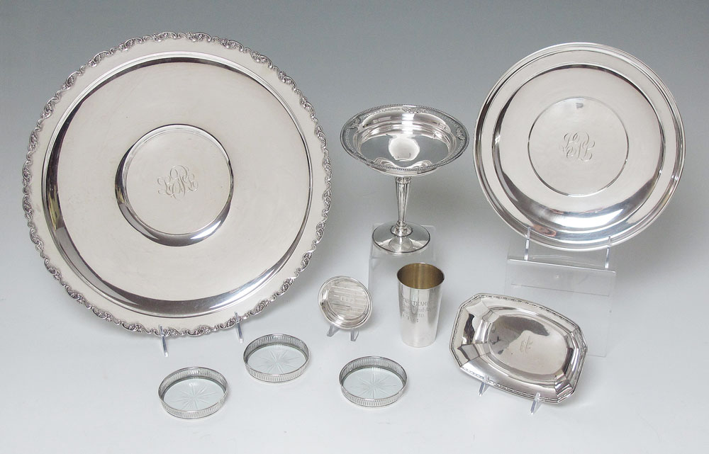 ESTATE COLLECTION OF STERLING ITEMS: To include 1) Mueck - Carey Co. tray with embossed floral rim, monogrammed. 14 3/4'' dia. 2) Richard Dimes tray #117T, monogrammed. 9 3/4'' dia. 3) Illegible maker dish, monogrammed. 1 1/2'' h. x 6 1/2'' x 4 3/8''. 4) Marked Sterling nut dish, monogrammed 2 3/4'' dia. 5) M Fred Hirsch weighted sterling compote, 8 1/4'' h. 6) William Binder German 835 silver presentation cup. 3 3/4'' h. x 2 1/4''. 6) 3 Sterling rimmed coasters, 3 1/8''. Approx. 36.6 troy oz.