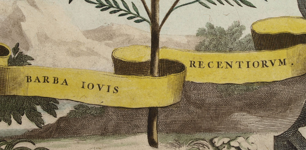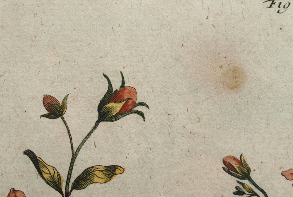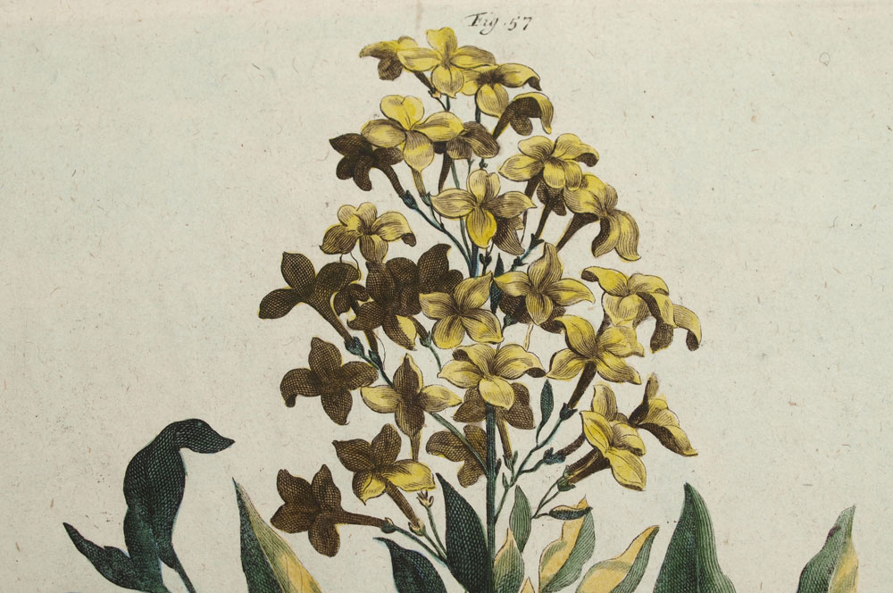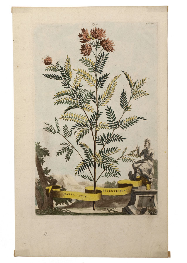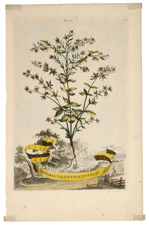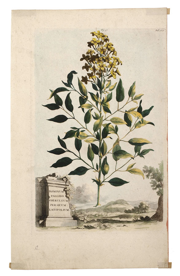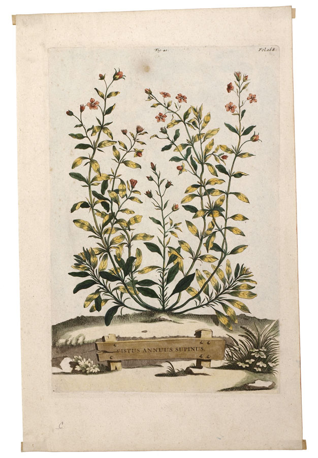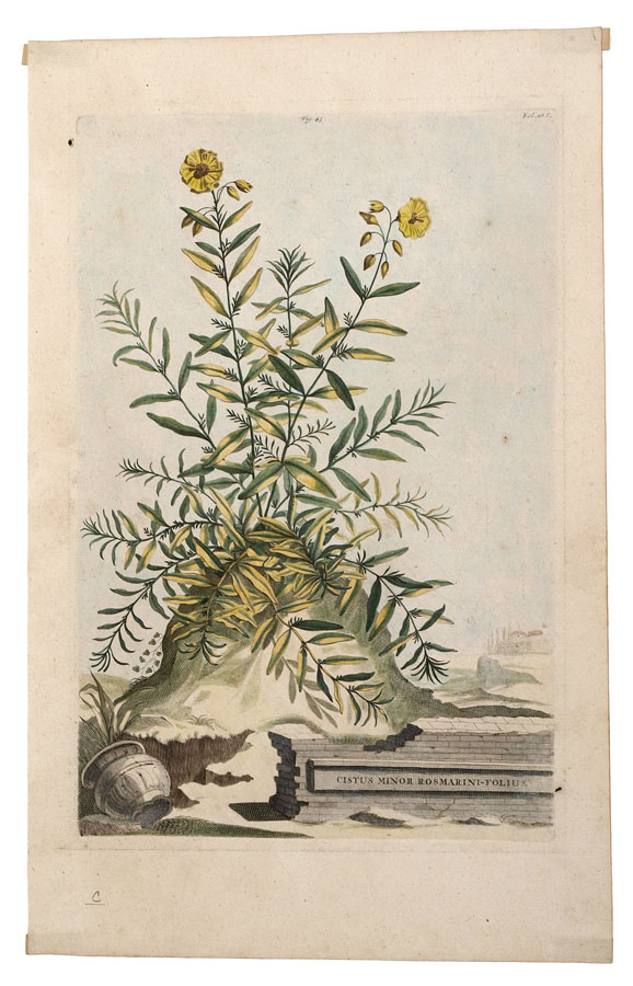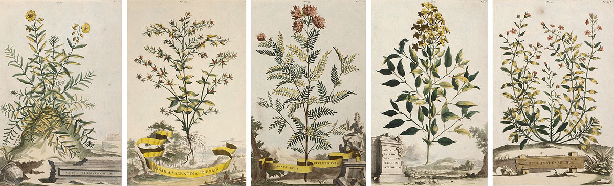 MUNTING, Abraham, (German, 1626-1683): Collection of 5 botanical etchings to include 1) ''Linaria Valentina Trifolia''. Figure 207, folio 720. 1702 folio edition of ''Naauwkeurige Beschryving Der Aardgewassen'', 16 1/4'' x 10 1/4'', plate 12 3/4'' x 8 1/2'' 2) ''Barba Iovis Recentiorum''. Figure 53, folio 215. 1702 folio edition of ''Naauwkeurige Beschryving Der Aardgewassen'', 16 1/4'' x 10'', plate 12 1/4'' x 8 1/4''. 3) ''Iasminum Pallido Coeruleum Piersicum Latifolium''. Figure 57, folio 227. 1702 folio edition of ''Naauwkeurige Beschryving Der Aardgewassen'', 16 1/4'' x 10'', plate 12 1/2'' x 8 1/4''. 4) ''Cistu Minor Rosmarini-Folius''. Figure 43, folio 168. 1702 folio edition of ''Naauwkeurige Beschryving Der Aardgewassen'', 16 1/4'' x 10 1/4'', plate 13'' x 8 1/2''. 5) ''Cistur Annuus Supinus''. Figure 41, folio 168. 1702 folio edition of ''Naauwkeurige Beschryving Der Aardgewassen'', 16 1/4'' x 10 1/4'', 12 1/2'' x 8 1/2''.