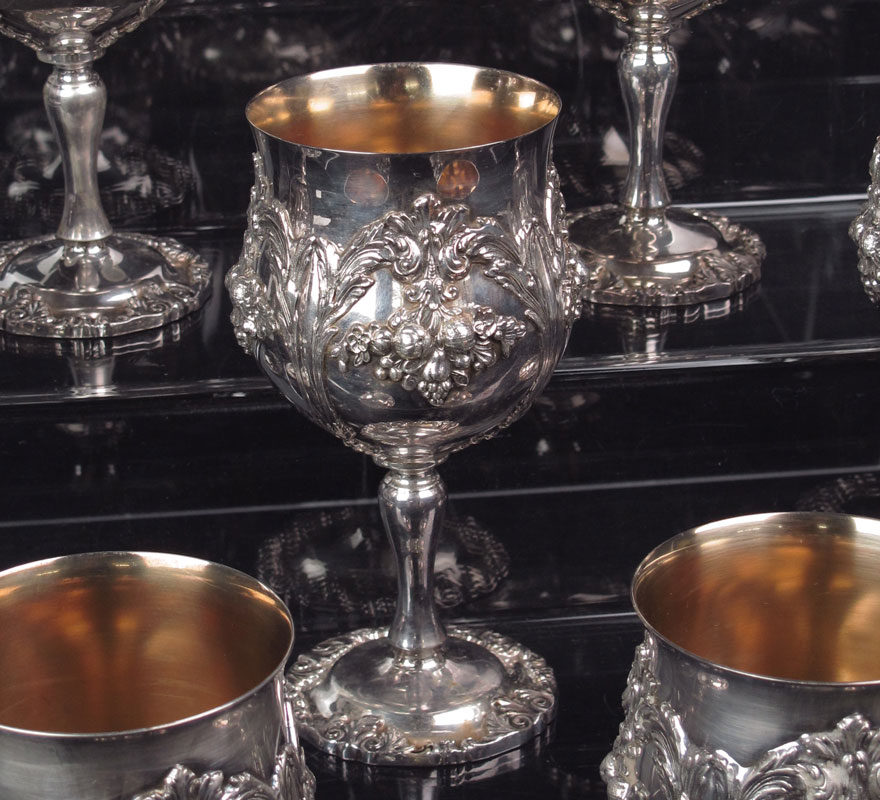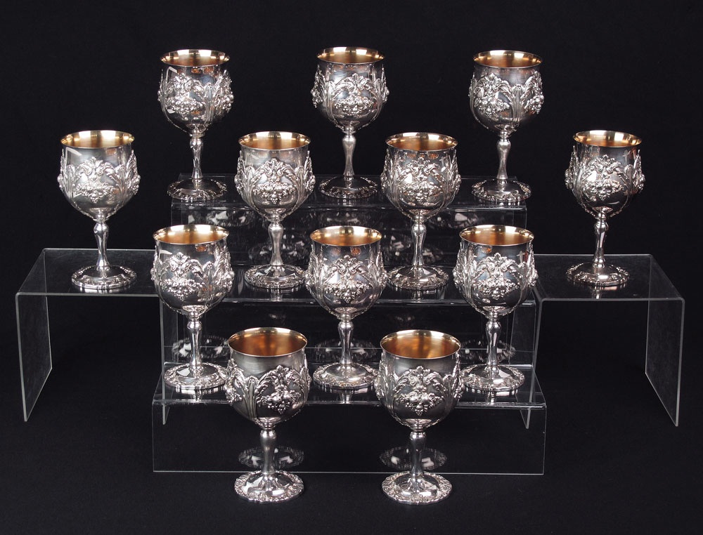 12 REED & BARTON RENAISSANCE SILVERPLATE GOBLETS: 12 goblets in the Renaissance pattern by Reed & Barton with embossed fruit and foliate motifs. Vermeil interior. Marked Reed & Barton, 6000, Renaissance. 6 1/4'' h. x 3 1/8''. CONDITION: Signs of use.