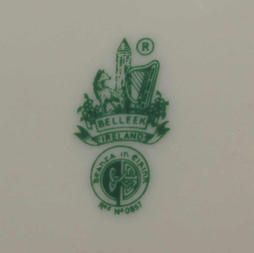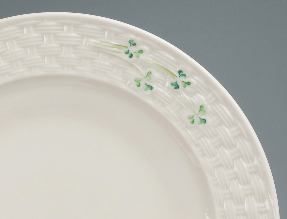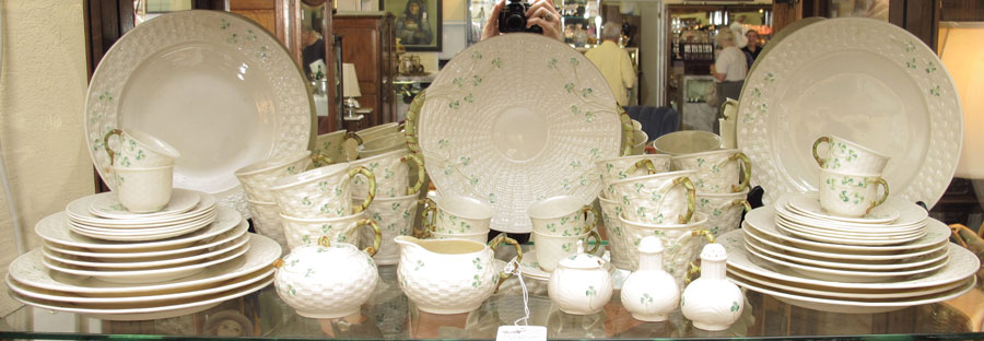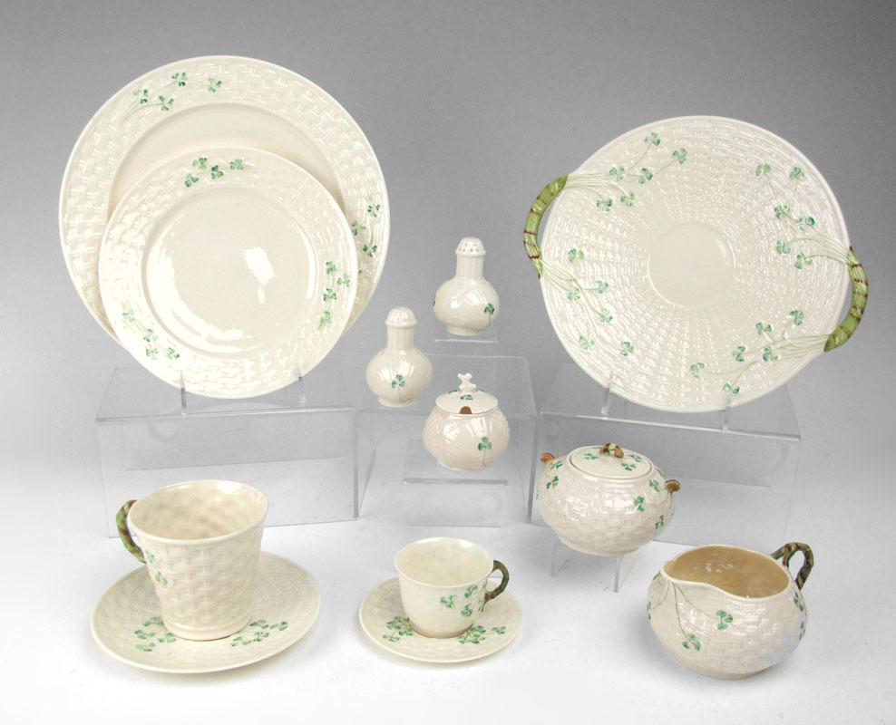 BELLEEK FINE IRISH CHINA IN THE SHAMROCK PATTERN: 60 pieces to include; 8 Dinner Plates (10 1/2''), 8 Salad Plates (8 1/4''), 12 Mugs, 12 saucers, Creamer, Sugar, 1 pair Salt & Pepper, 1 Mustard, 8 Demi-tasse cups with 8 Sauces, and 1 Open Handle Cake plate (12''). Green backstamp.