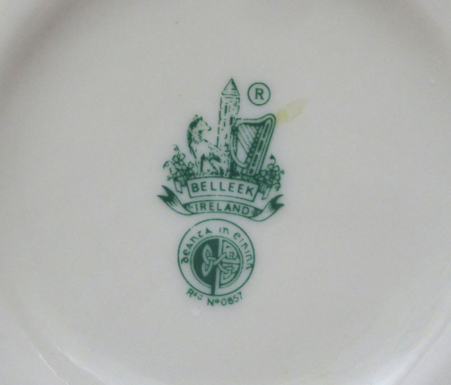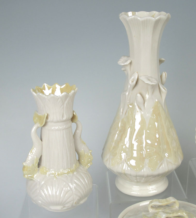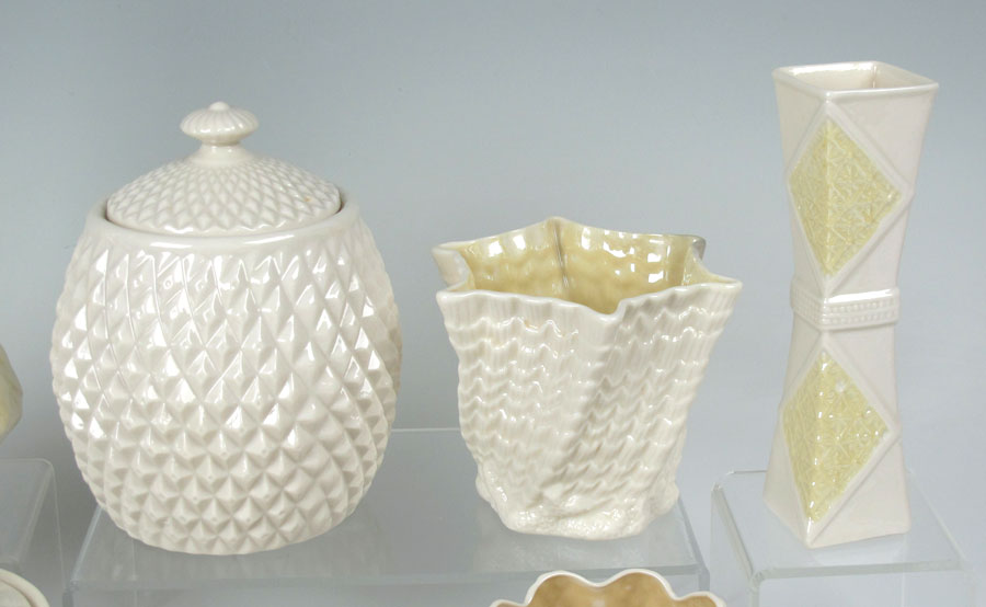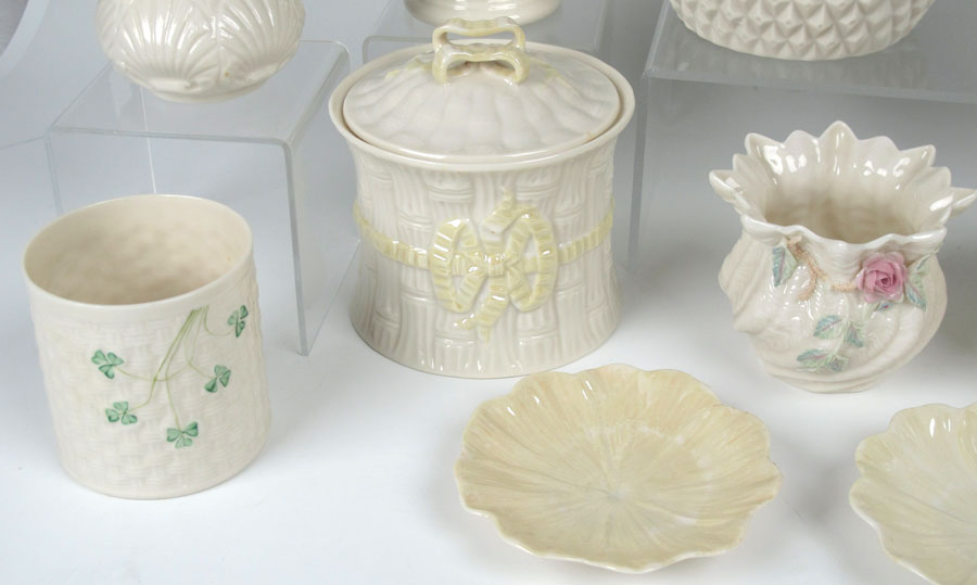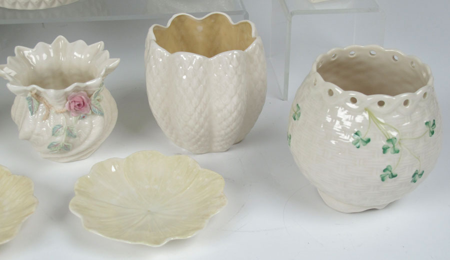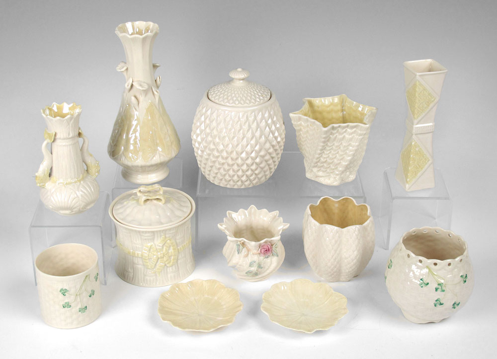 12 PIECE IRISH BELLEEK PORCELAIN: An assembled collection with assorted vases, covered jars and trays. With green and yellow Belleek marks. Tallest vase measures 9 1/2'' x 4 1/2''.